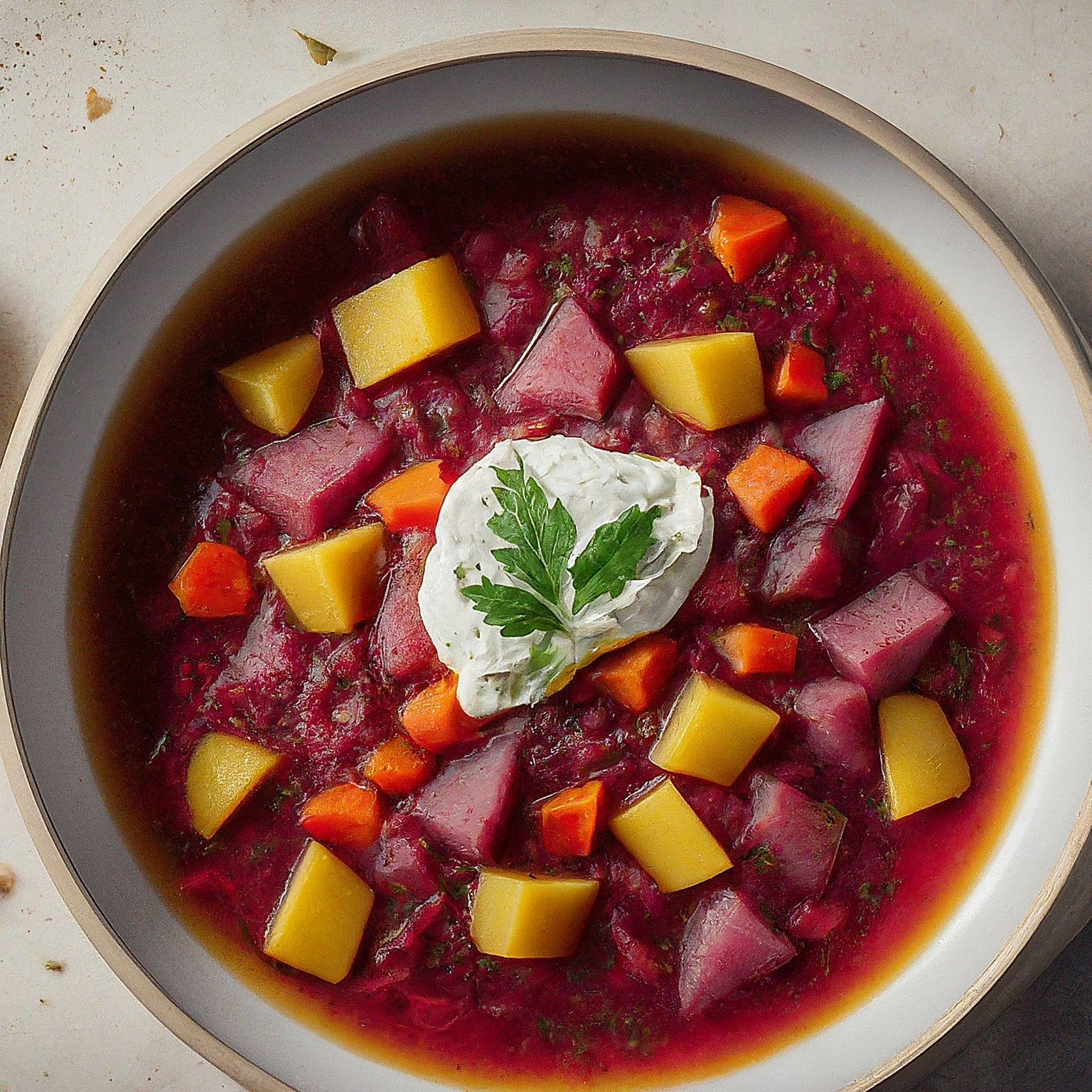 Dieser tiefrote Borschtsch ist ein Klassiker der osteuropäischen Küche. Mit Rinderbrühe, viel Gemüse und einem Klecks Sauerrahm wird er Sie begeistern. Ein wärmendes und sättigendes Gericht für kalte Tage.