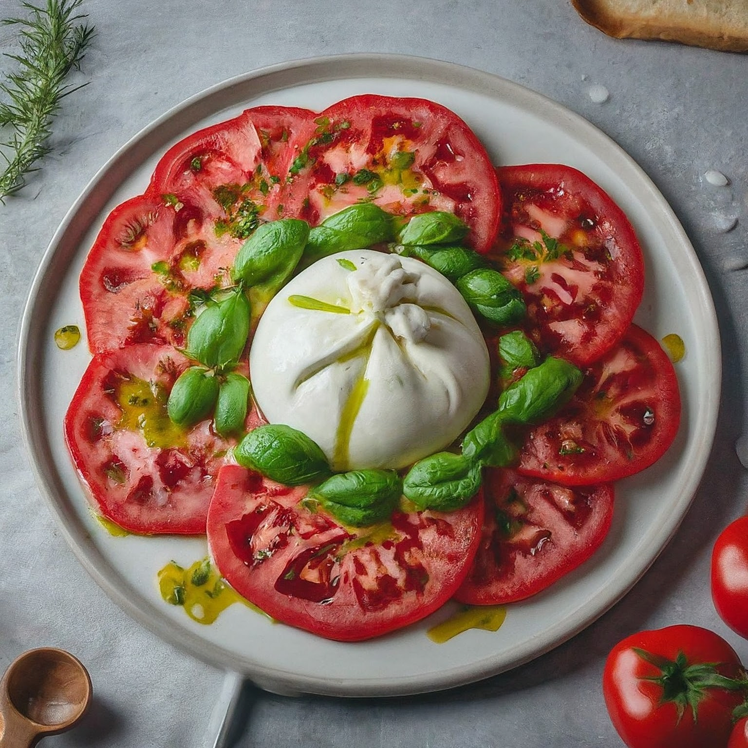 Ein sommerlich-leichtes Rezept mit cremiger Burrata, saftigem Tomatencarpaccio und frischem Basilikum. Ideal als Vorspeise oder leichtes Hauptgericht.