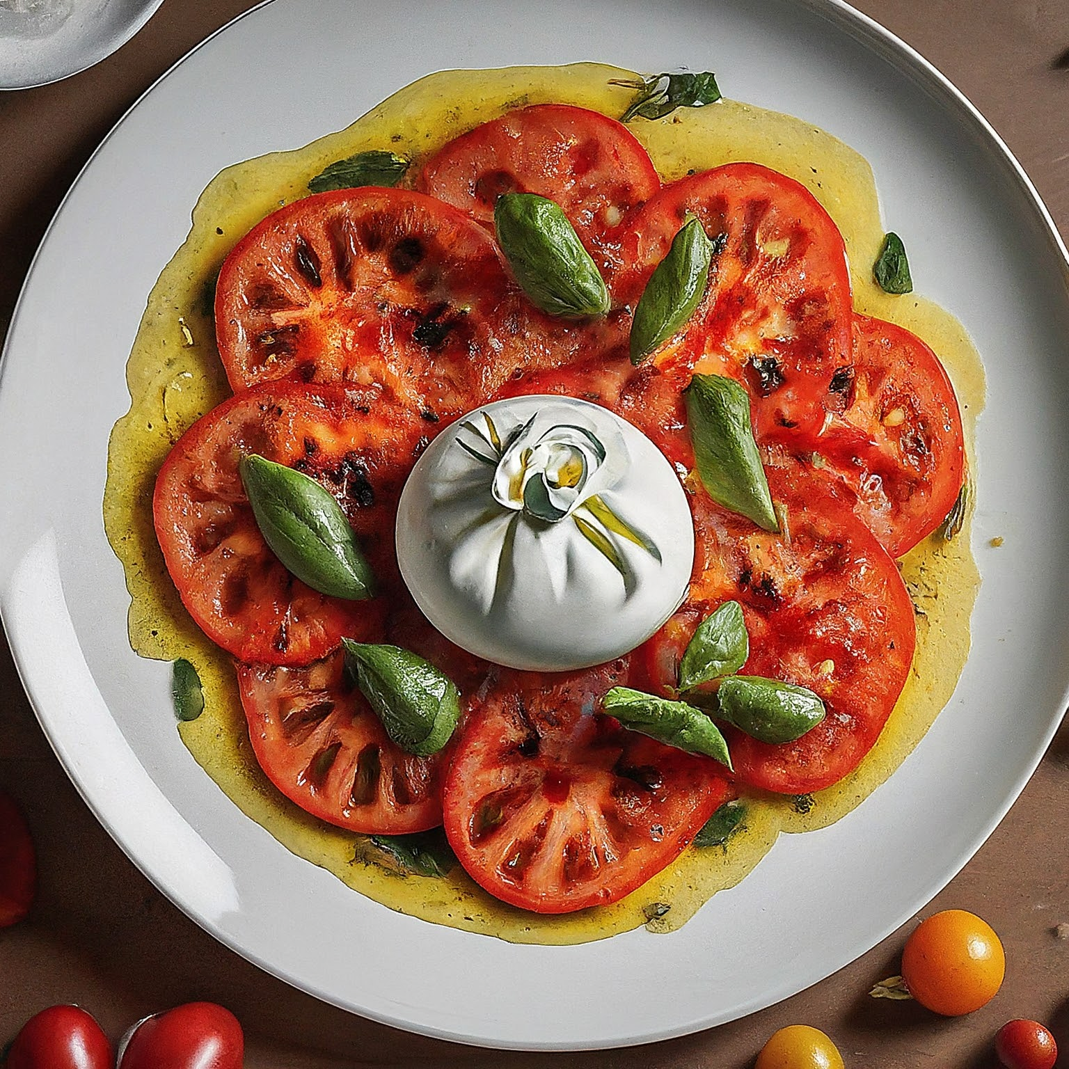 Ein erfrischendes und leichtes Sommergericht: Cremiger Burrata auf süßem Tomatencarpaccio mit Basilikum.