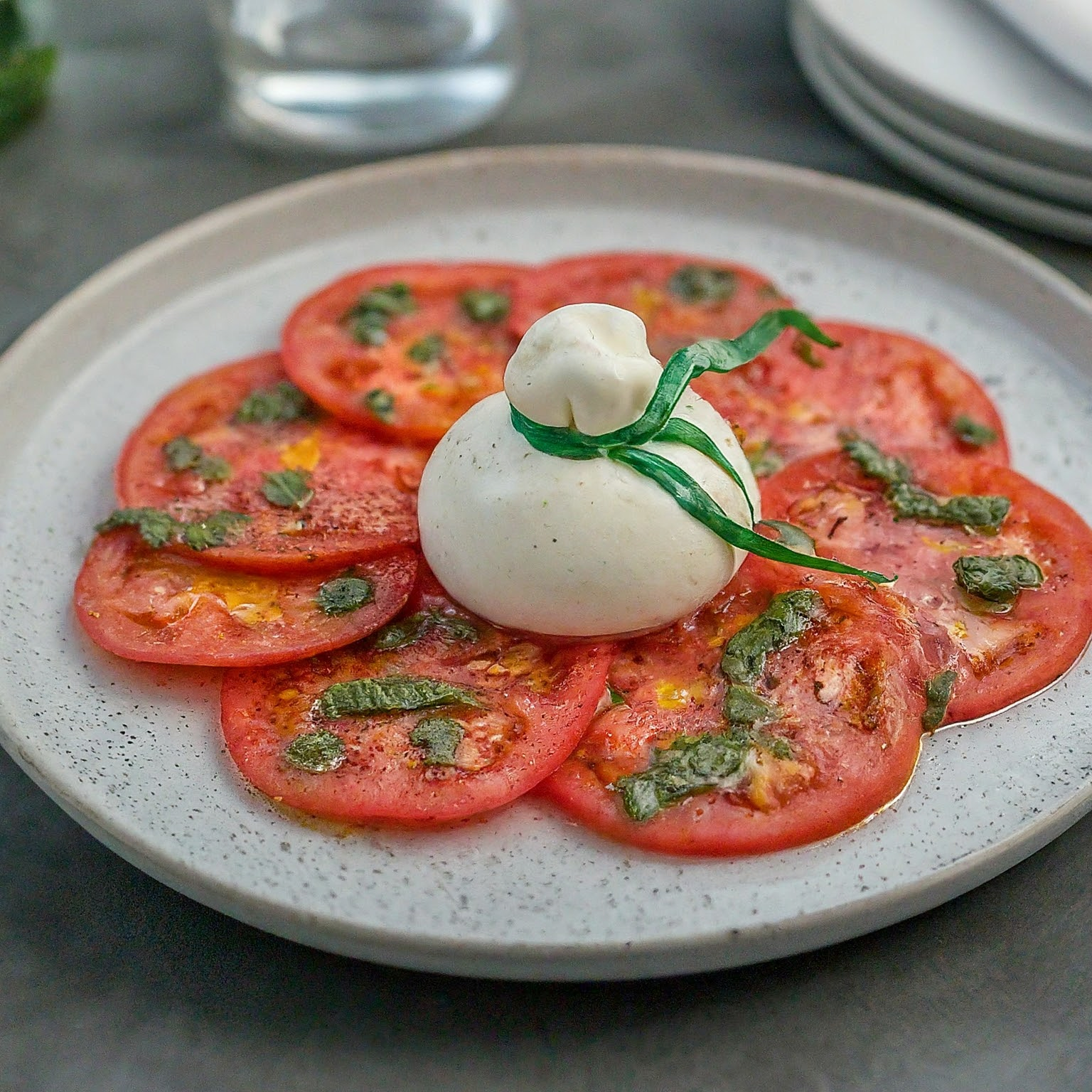 Ein sommerlich-leichtes Rezept: Cremige Burrata auf fruchtigem Tomatencarpaccio. Ideal als Vorspeise oder leichter Snack.