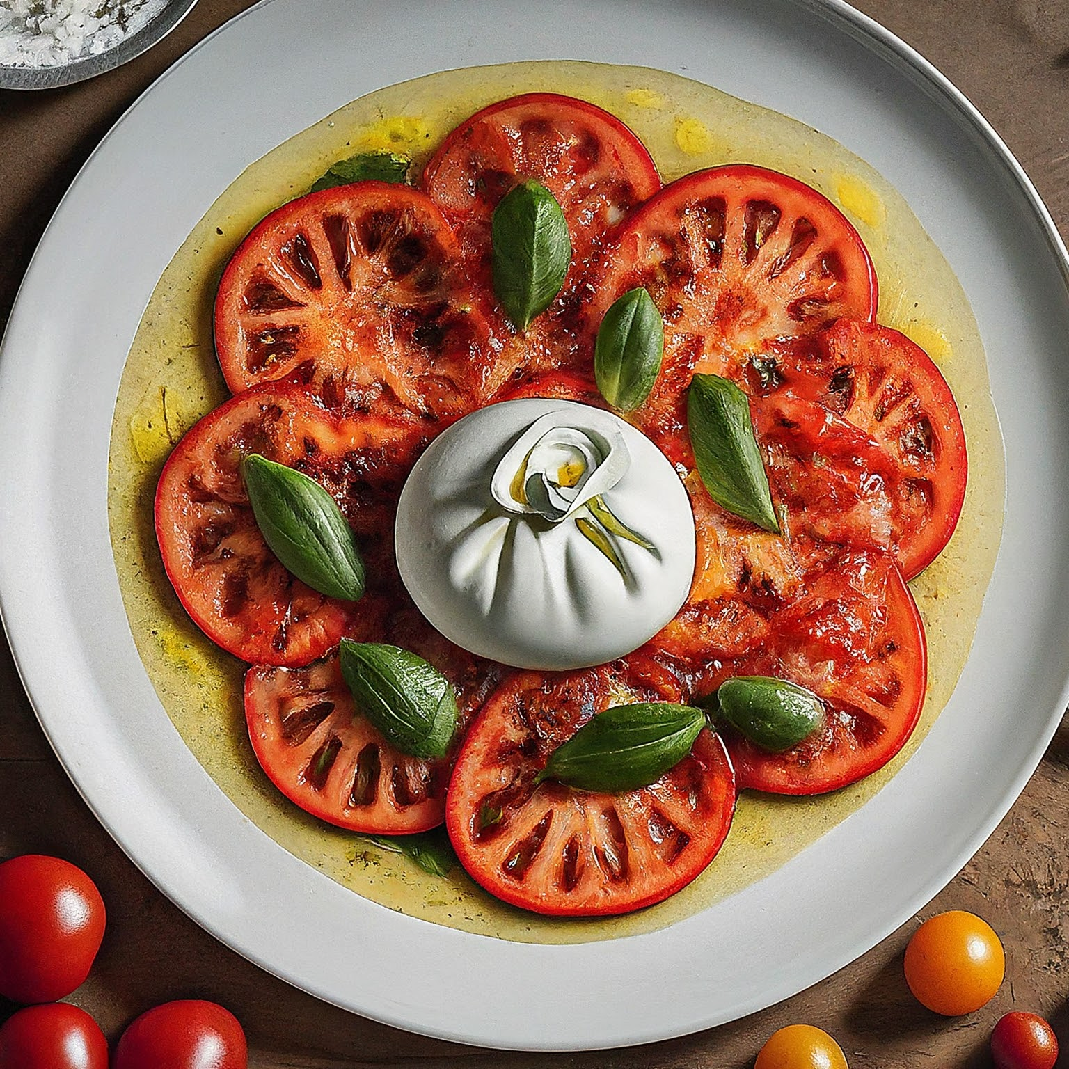 | 4. | Burrata vorsichtig aus der Verpackung nehmen und auf den Tomaten platzieren. |