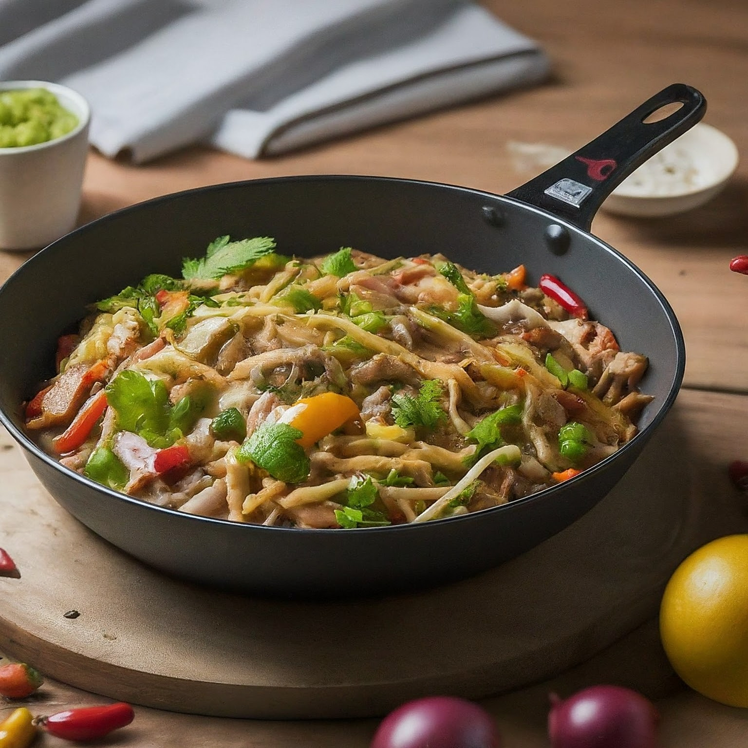 | 8. | Hähnchenfleisch zurück in den Wok geben und mit der Soße vermengen. |