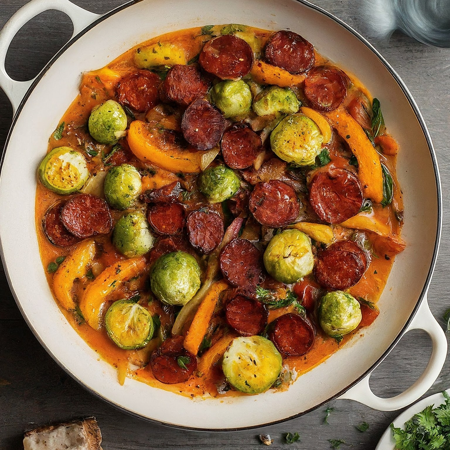 Eine würzige und einfache Chorizo Gemüsepfanne aus dem Ofen, perfekt für ein schnelles Abendessen.