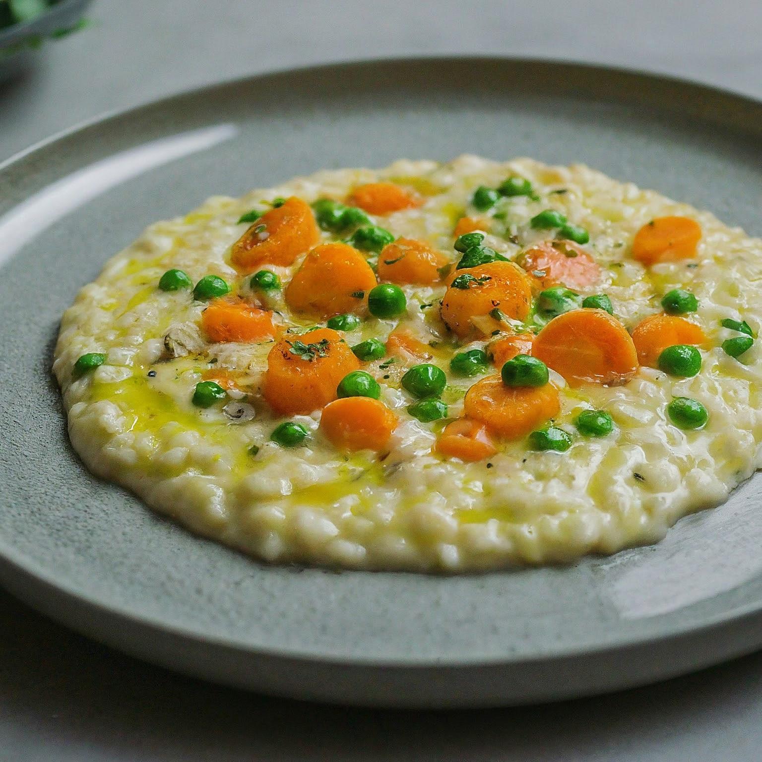 Ein cremiges und gesundes Graupenrisotto mit frischen Erbsen und Karotten – die perfekte Mahlzeit für jeden Tag.