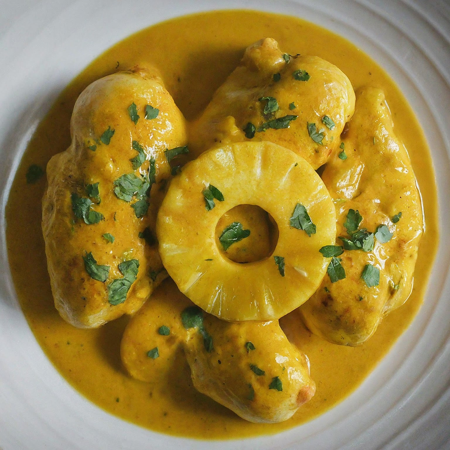 | 6. | Ananasstücke hinzufügen und ca. 15 Minuten köcheln lassen, bis das Hähnchen gar ist. |