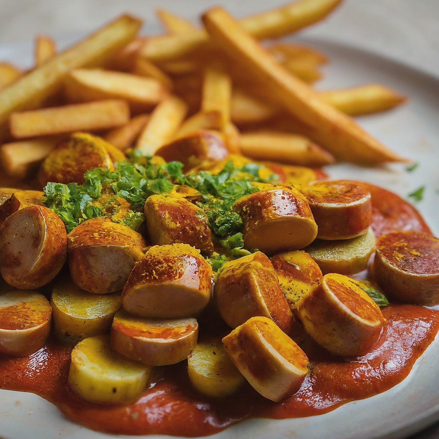 Knusprige Currywurst mit perfekt gebräunten Pommes aus der Heißluftfritteuse - schnell, einfach und unwiderstehlich lecker!