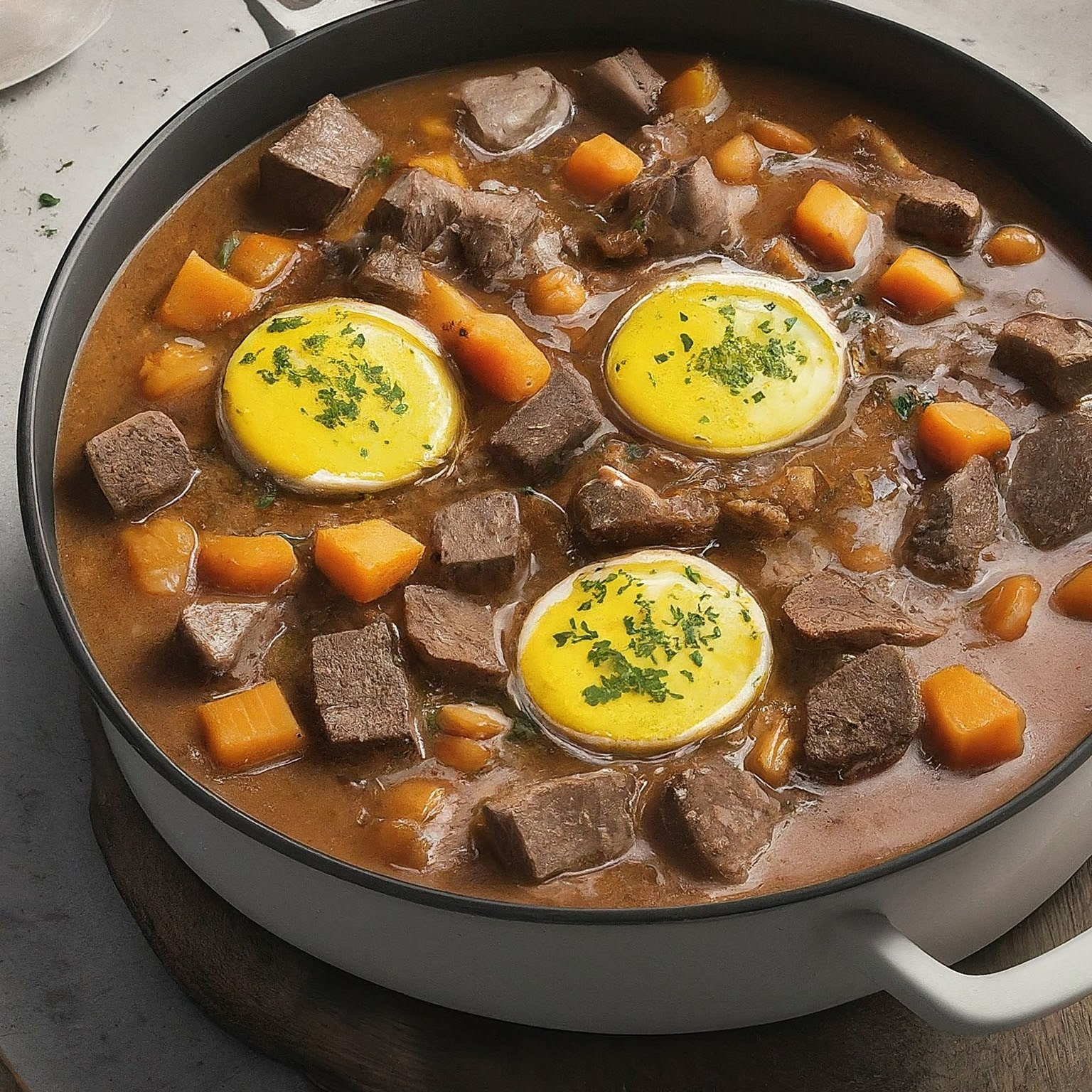 6.Alles zum Kochen bringen, dann die Hitze reduzieren und zugedeckt ca. 60 Minuten köcheln lassen, bis das Fleisch und das Gemüse gar sind.