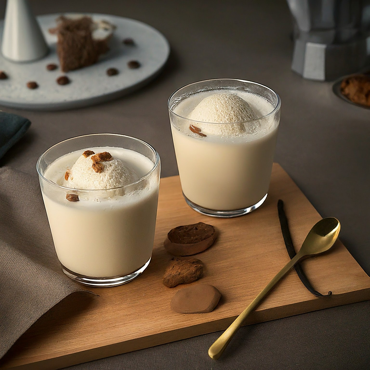 Ein erfrischender Eiskaffee mit Vanilleeis und Milch – perfekt für heiße Tage.