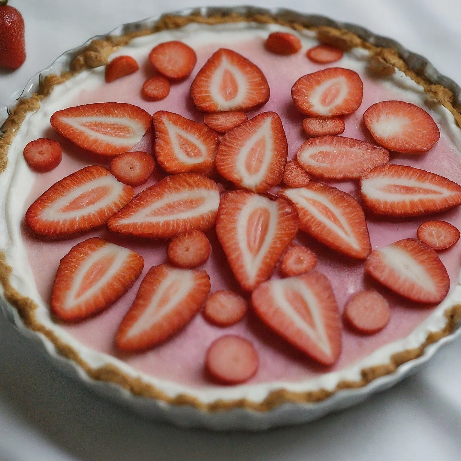 3.Den abgekühlten Boden mit der Quark-Sahne-Creme bestreichen und mit Erdbeeren belegen.
