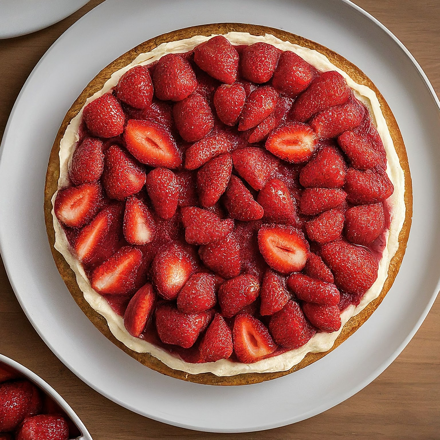 8.Optional: Tortenguss nach Packungsanleitung zubereiten und über die Erdbeeren geben.