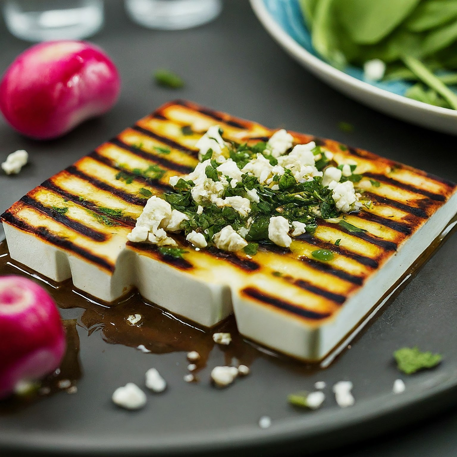 | 6. | Für ca. 5-7 Minuten pro Seite grillen, bis der Feta goldbraun und leicht knusprig ist. |
