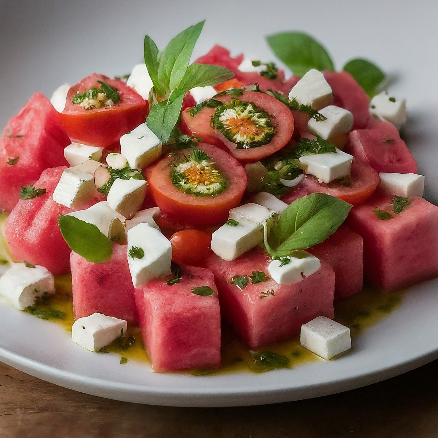 Ein erfrischender Sommersalat mit Wassermelone, Feta, Gurke und Tomaten – die perfekte Kombination aus süß und salzig.