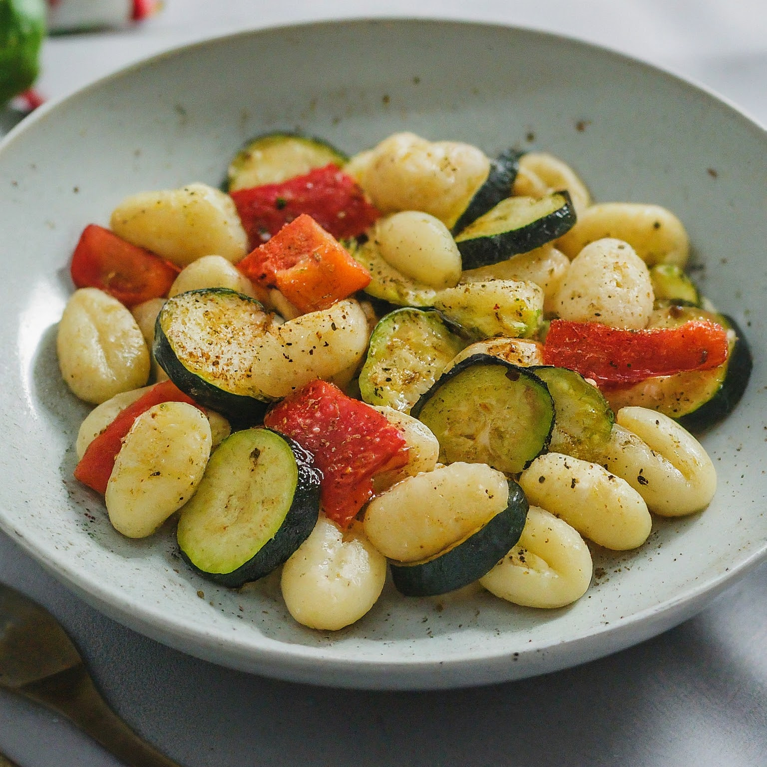 Ein leichter und erfrischender Gnocchi Salat mit gebratenen Zucchini und Paprika, perfekt für warme Sommertage.