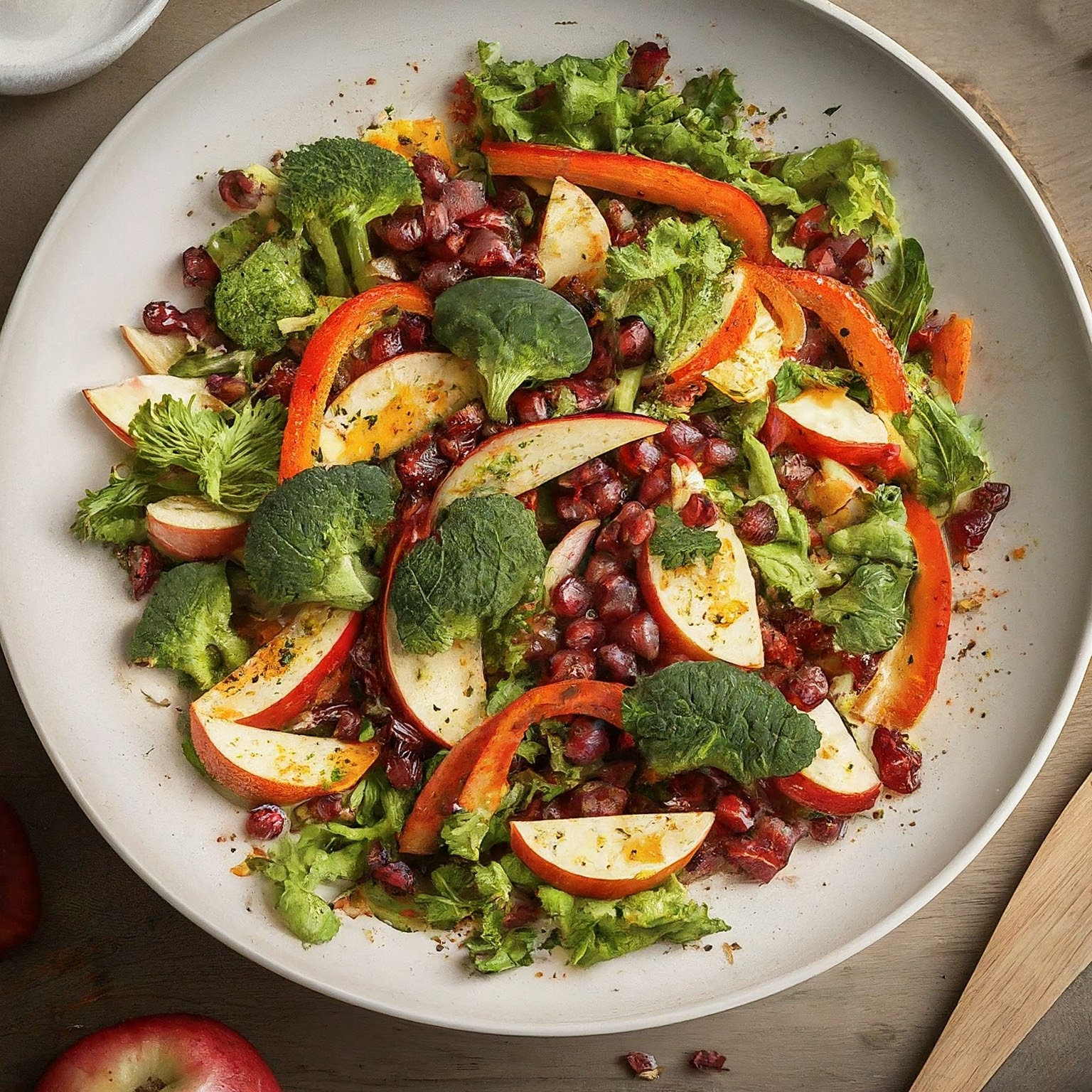 Ein erfrischender Salat mit Granatapfelkernen, Brokkoli, Paprika und Apfel. Einfach zuzubereiten und voller Vitamine!
