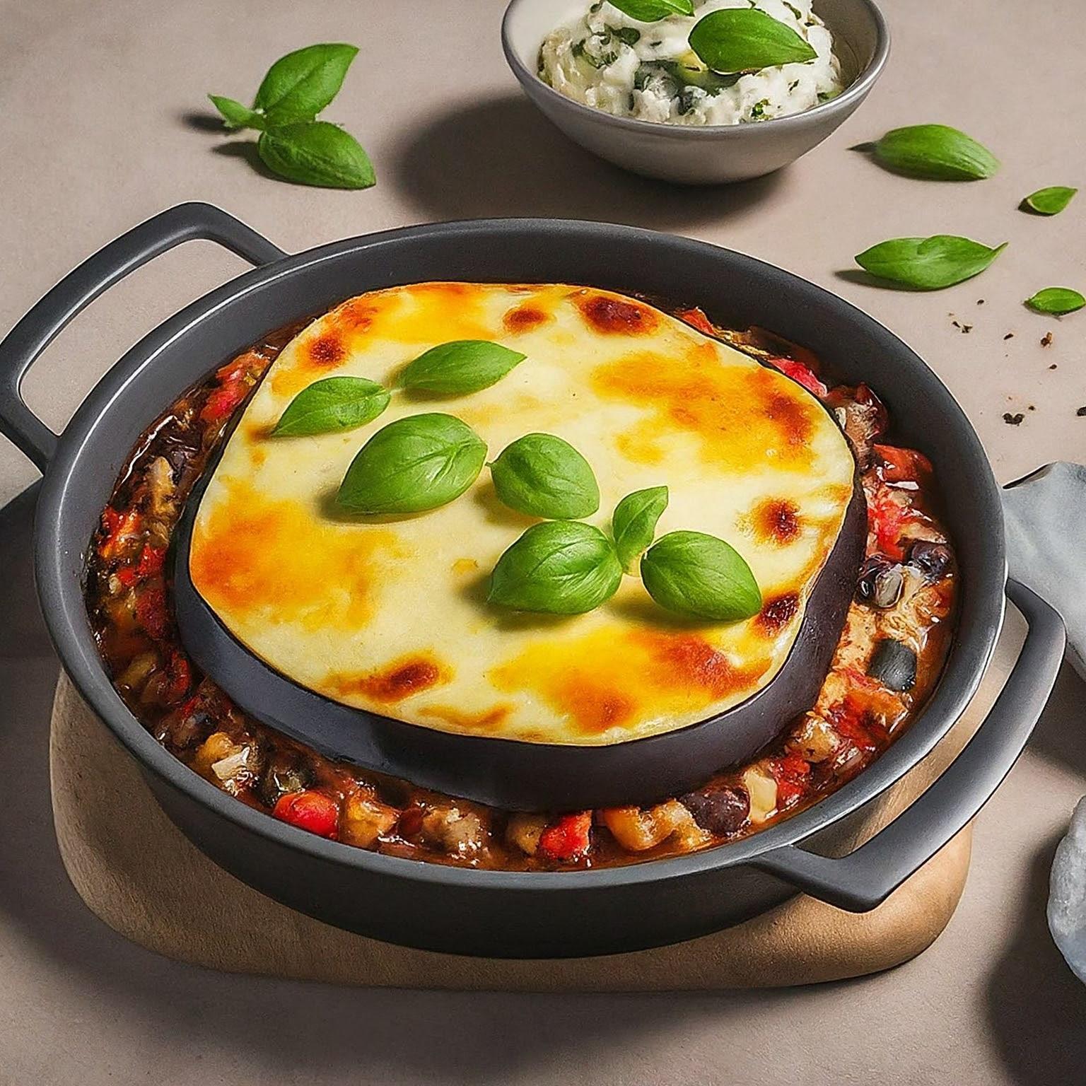 | 5. | In einer Auflaufform abwechselnd Auberginenscheiben und Hackfleischsauce schichten. Mit Béchamelsauce bedecken und im vorgeheizten Ofen bei 180°C ca. 45 Minuten backen. |