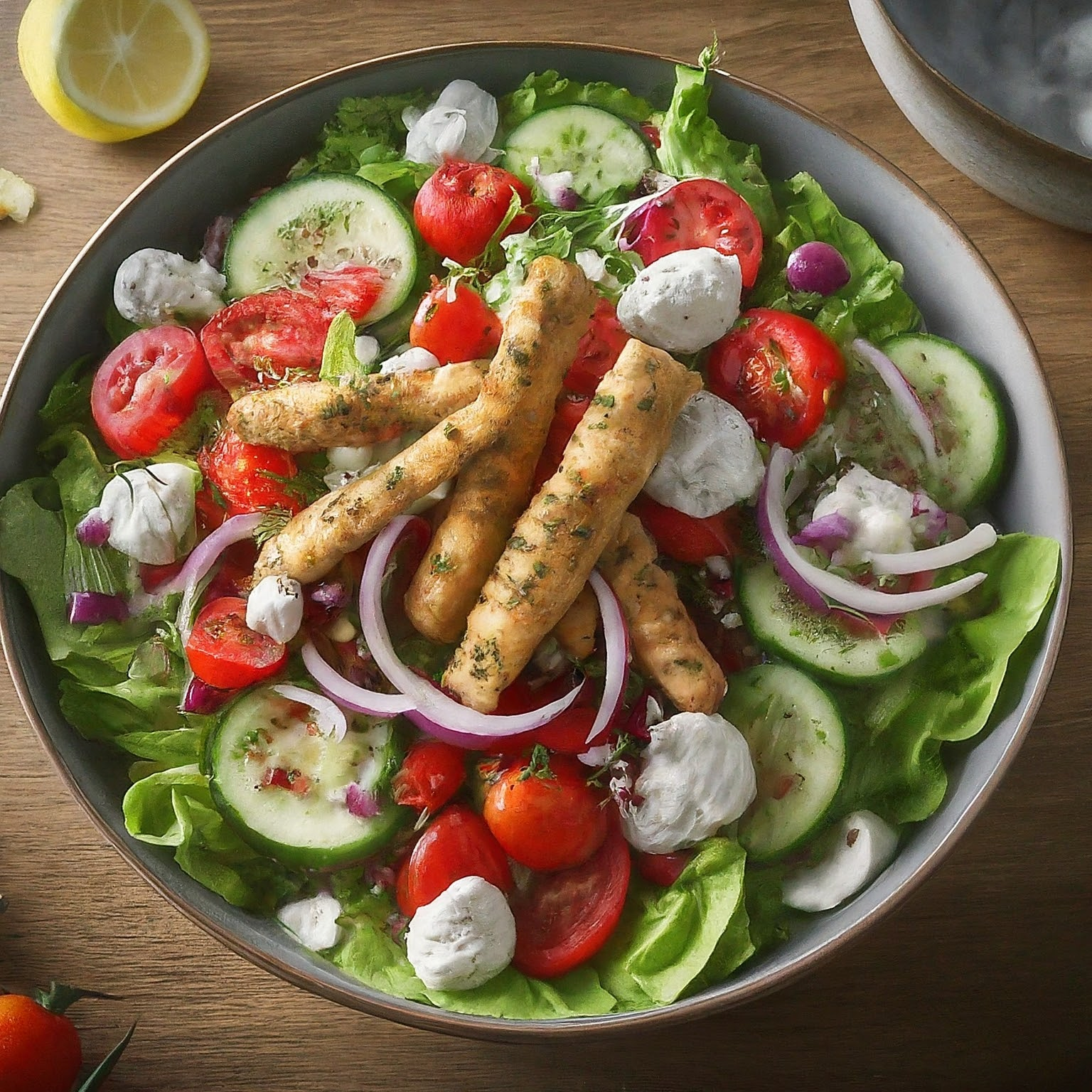 Ein erfrischender Gyros Salat mit saftigem Fleisch, knackigem Gemüse und cremigem Tzatziki-Dressing. Perfekt für heiße Tage!