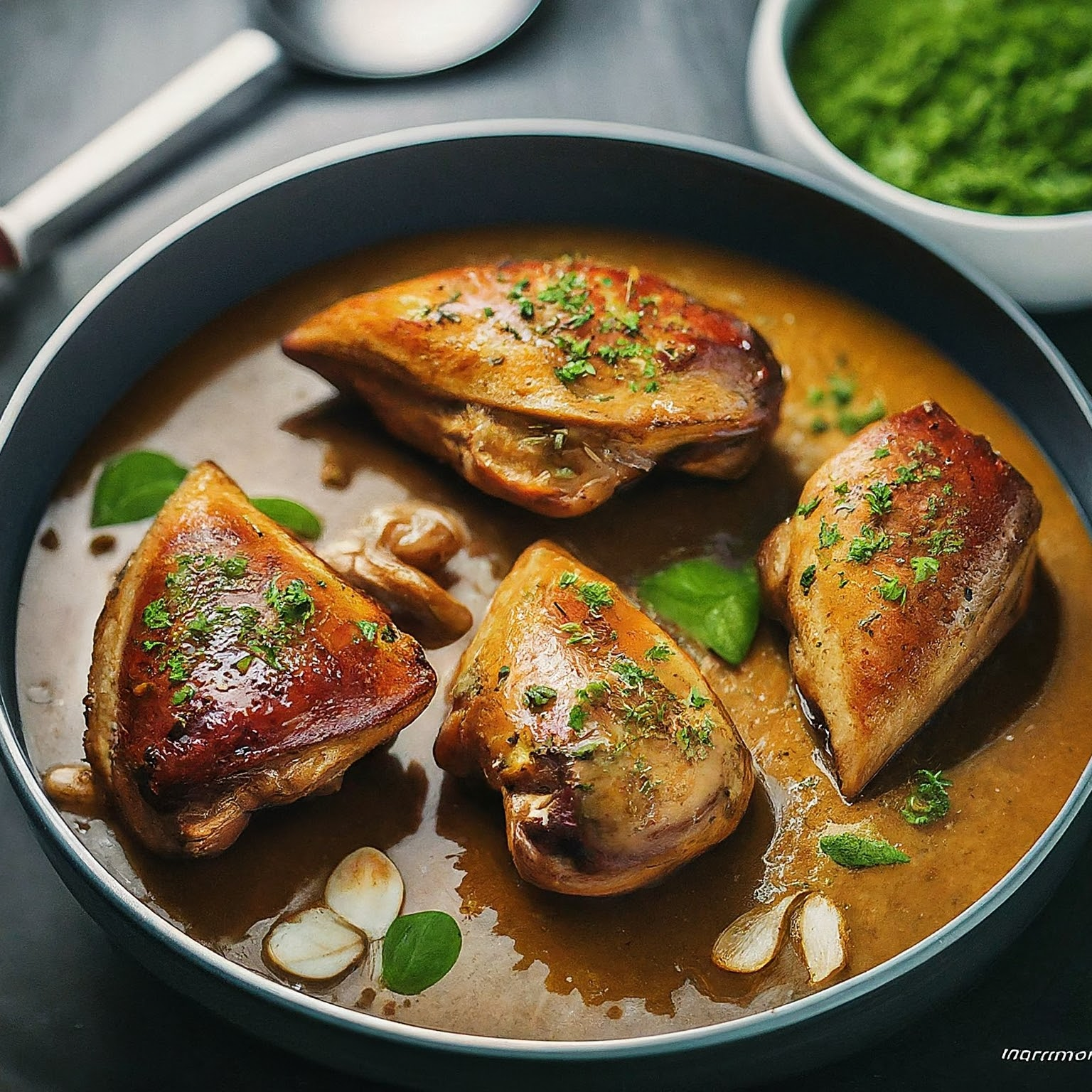 8.Vor dem Servieren Garprobe durchführen. Das Hähnchen ist gar, wenn beim Einstechen in die dickste Stelle klarer Fleischsaft austritt.