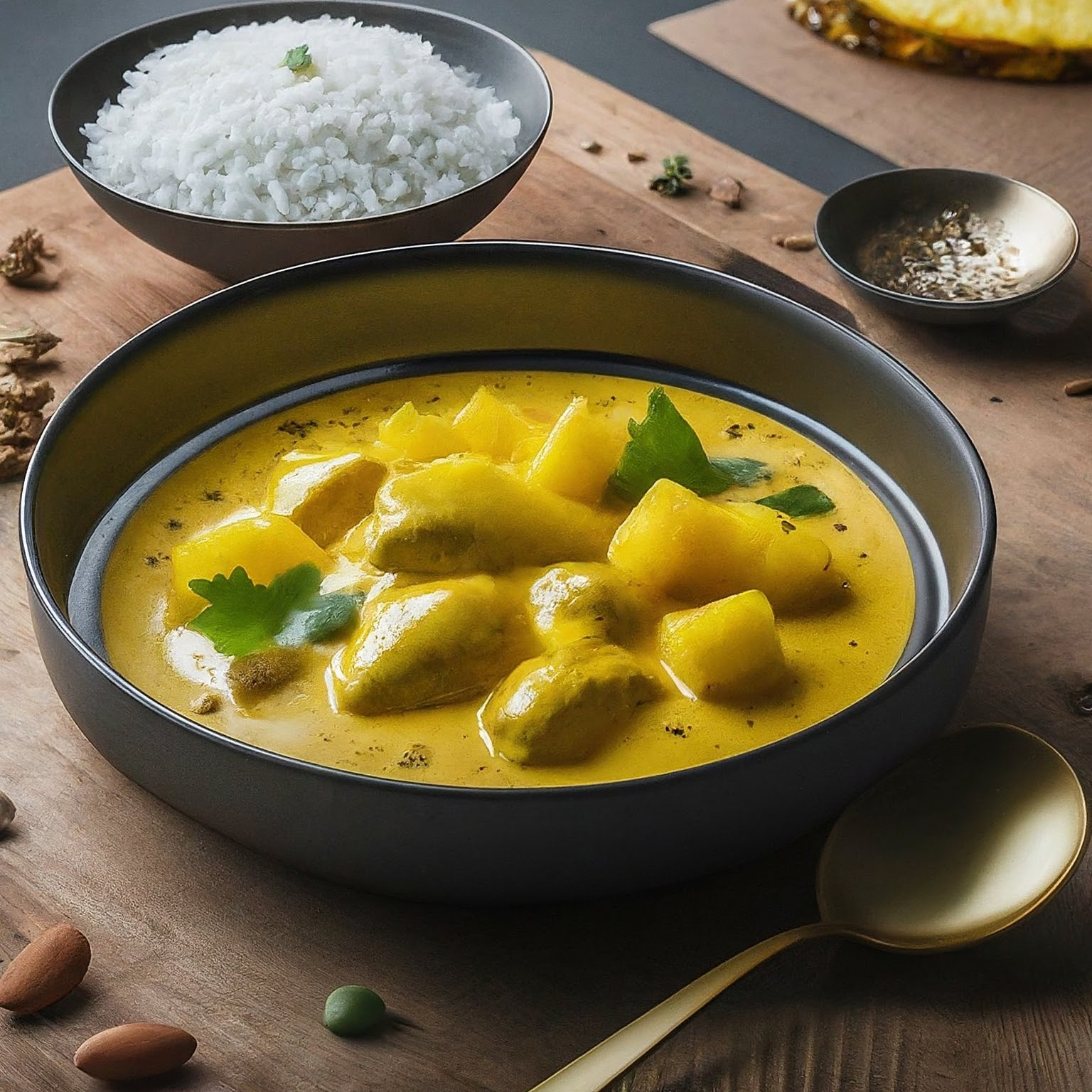 Ein exotisches Hähnchen-Ananas-Curry mit Reis, schnell zubereitet und voller Geschmack. Cremige Kokosmilch und fruchtige Ananas harmonieren perfekt mit zartem Hähnchen.