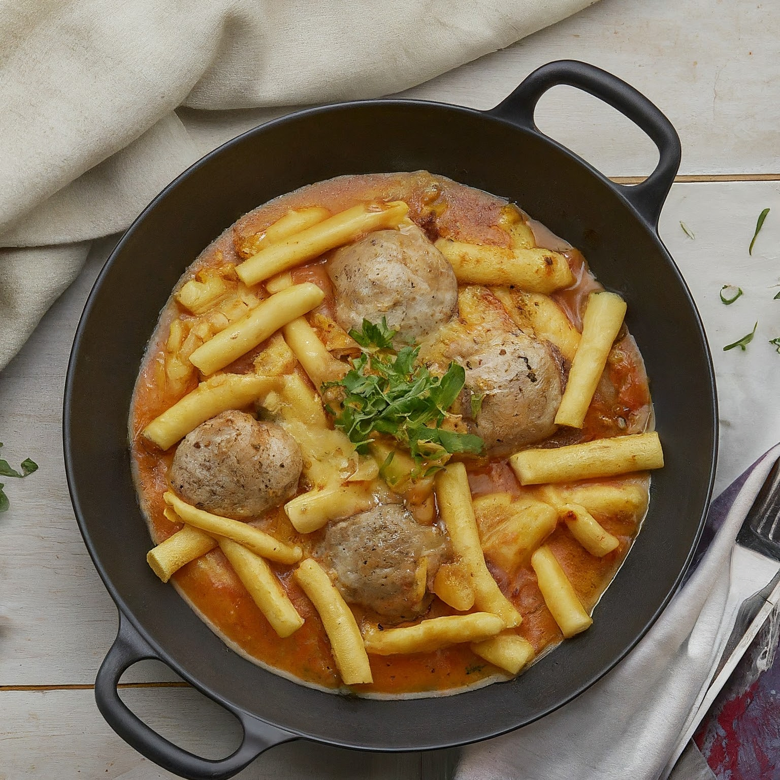| 3. | Zwiebeln und Champignons hinzufügen und kurz mitbraten. |