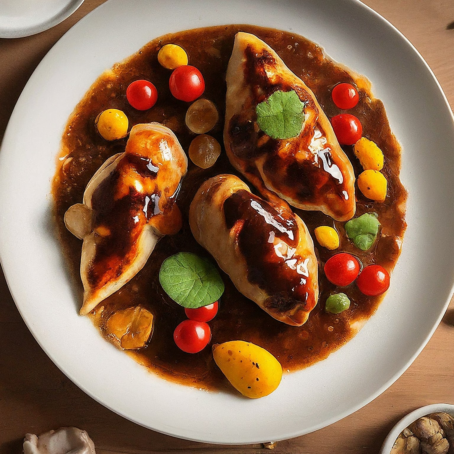 5.Im vorgeheizten Backofen bei 180°C (Umluft) ca. 35 Minuten backen, oder auf dem Grill grillen, bis das Hähnchen gar und die Sauce karamellisiert ist.