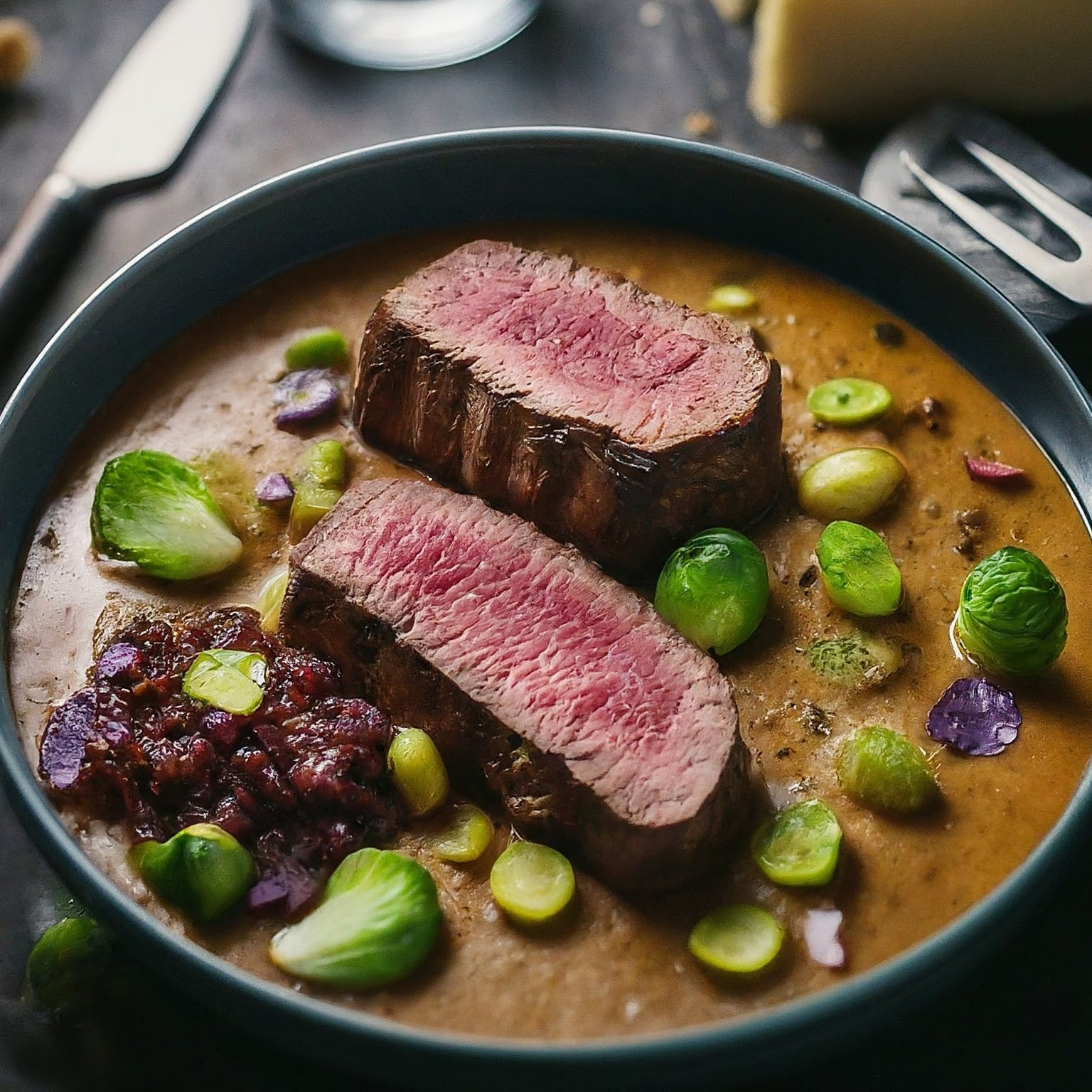 Hacksteak Hubertus: Ein saftiges Hacksteak mit cremiger Champignon-Rahmsoße und Preiselbeeren - perfekt für ein herbstliches Abendessen.