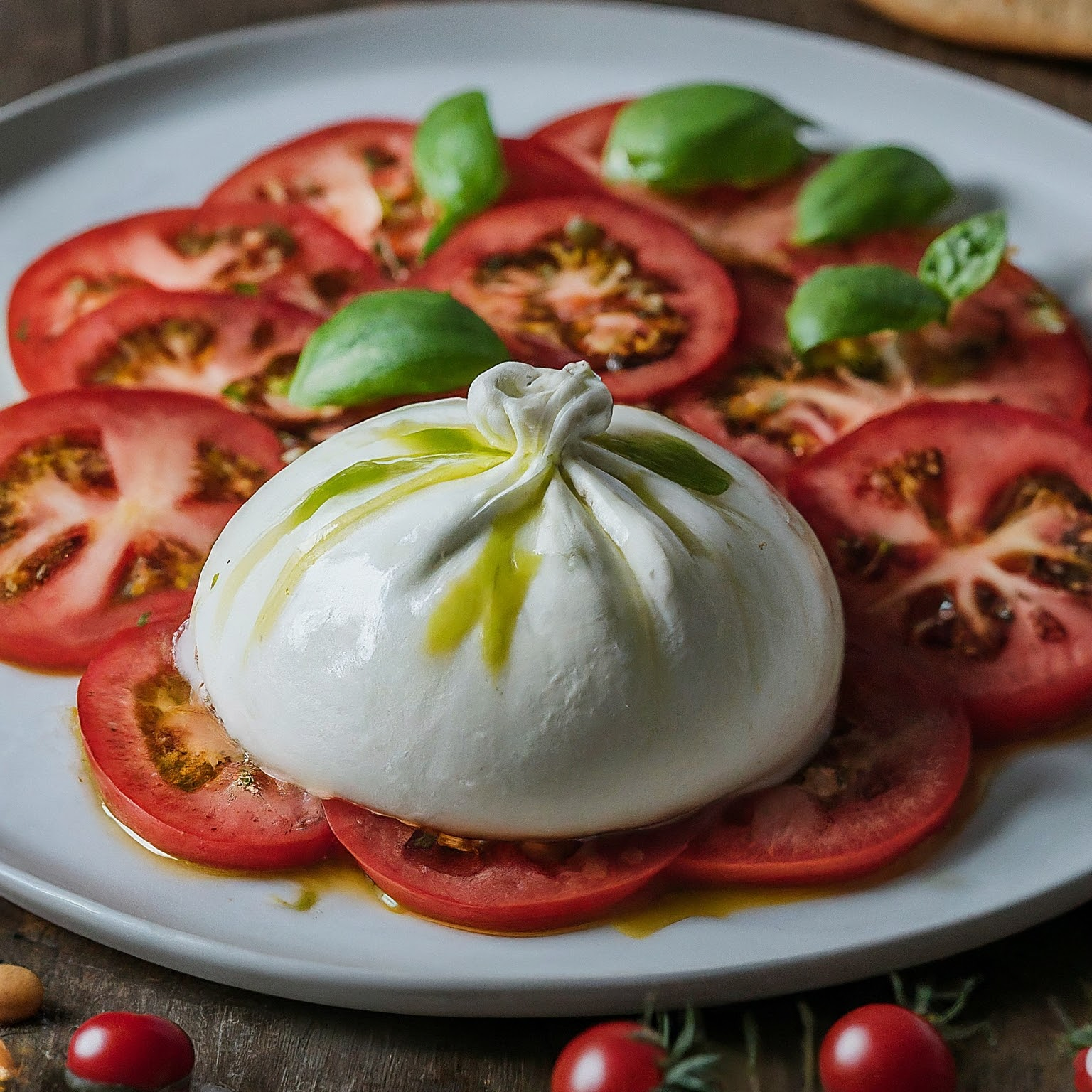 Ein schnelles und einfaches Rezept für Burrata auf Tomatencarpaccio. Die cremige Burrata trifft auf süße Tomaten – ein sommerlicher Genuss!
