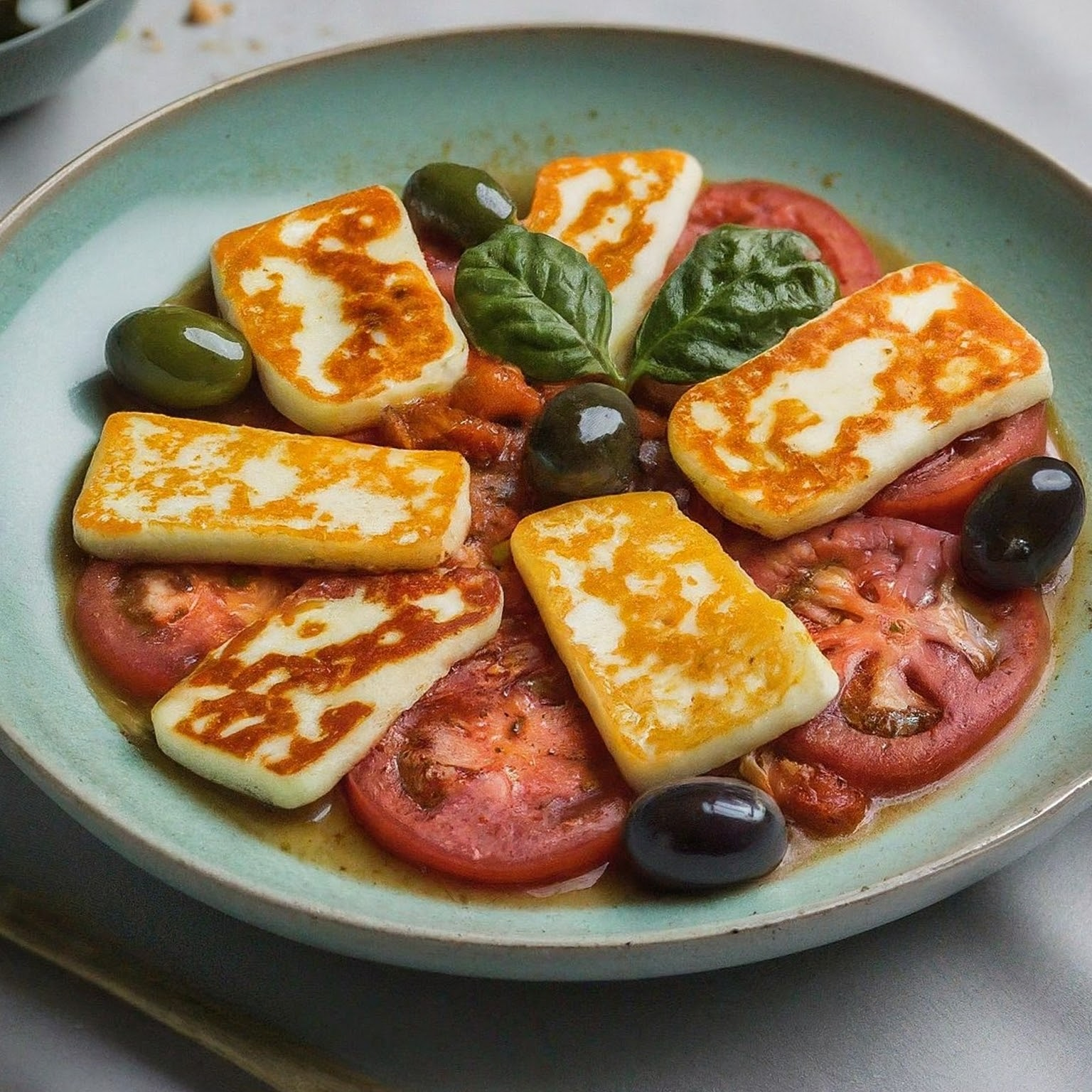 Gebratener Haloumi mit Tomaten und Oliven - ein schnelles und einfaches Rezept für ein mediterranes Geschmackserlebnis.