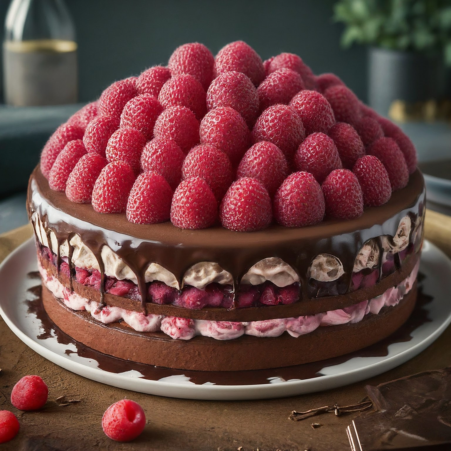 Ein unwiderstehlicher Genuss: Saftiger Schokoladenbiskuit trifft auf fruchtige Himbeerfüllung und cremige Schokoladenganache.