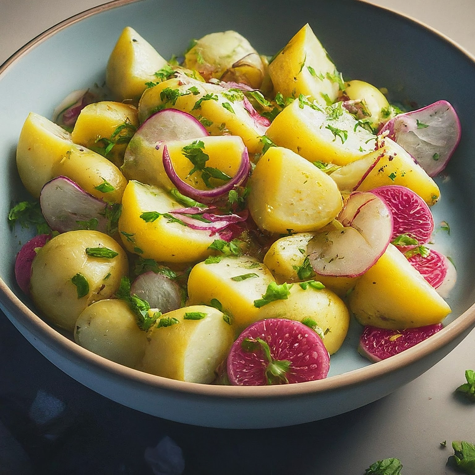 | 4. | Die warmen Kartoffelscheiben mit dem Zwiebeldressing vermengen. |