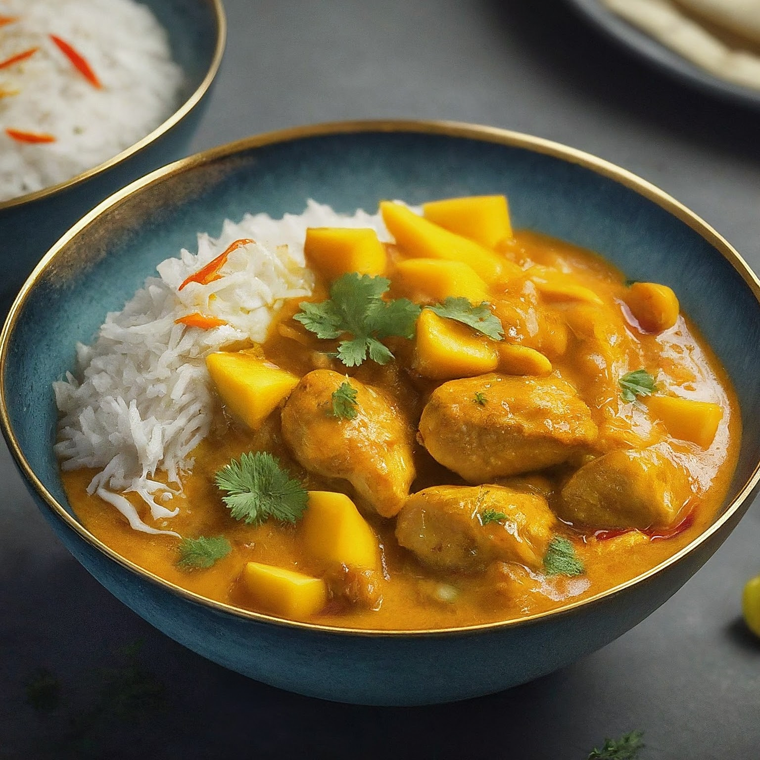 Ein exotisches Mango Chicken Curry mit zartem Hähnchenfleisch in cremiger Kokosmilch-Sauce. Die Süße der Mango trifft auf die Schärfe von Ingwer und Chili – ein Geschmackserlebnis der Extraklasse!