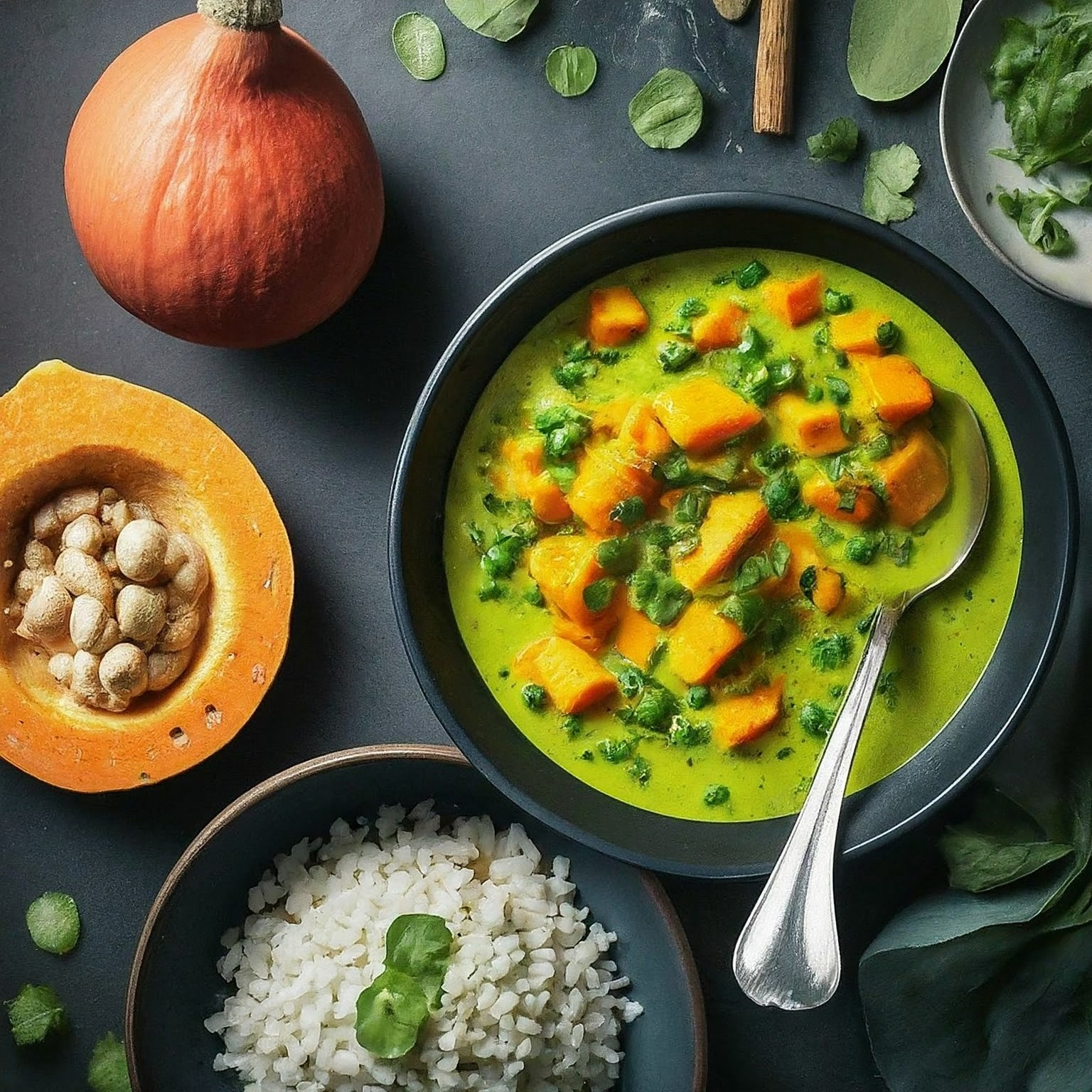 Ein cremiges grünes Curry mit zartem Kürbis, Kokosmilch und aromatischen Gewürzen. Perfekt für kühle Herbstabende!