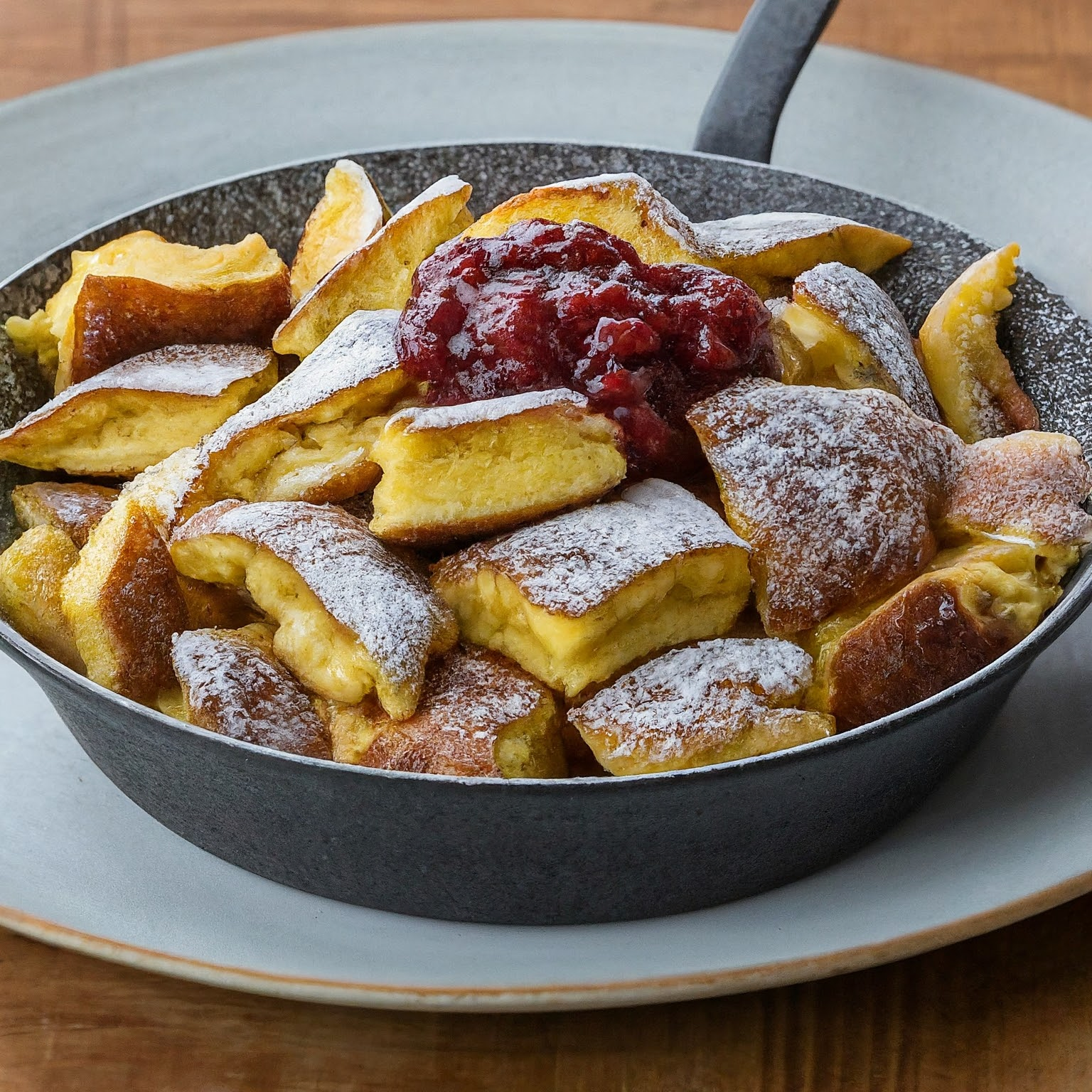 Ein luftig-leichter Kaiserschmarrn nach original Tiroler Landgasthofrezept. Mit Rosinen, Puderzucker und Zwetschgenröster ein wahrer Genuss!