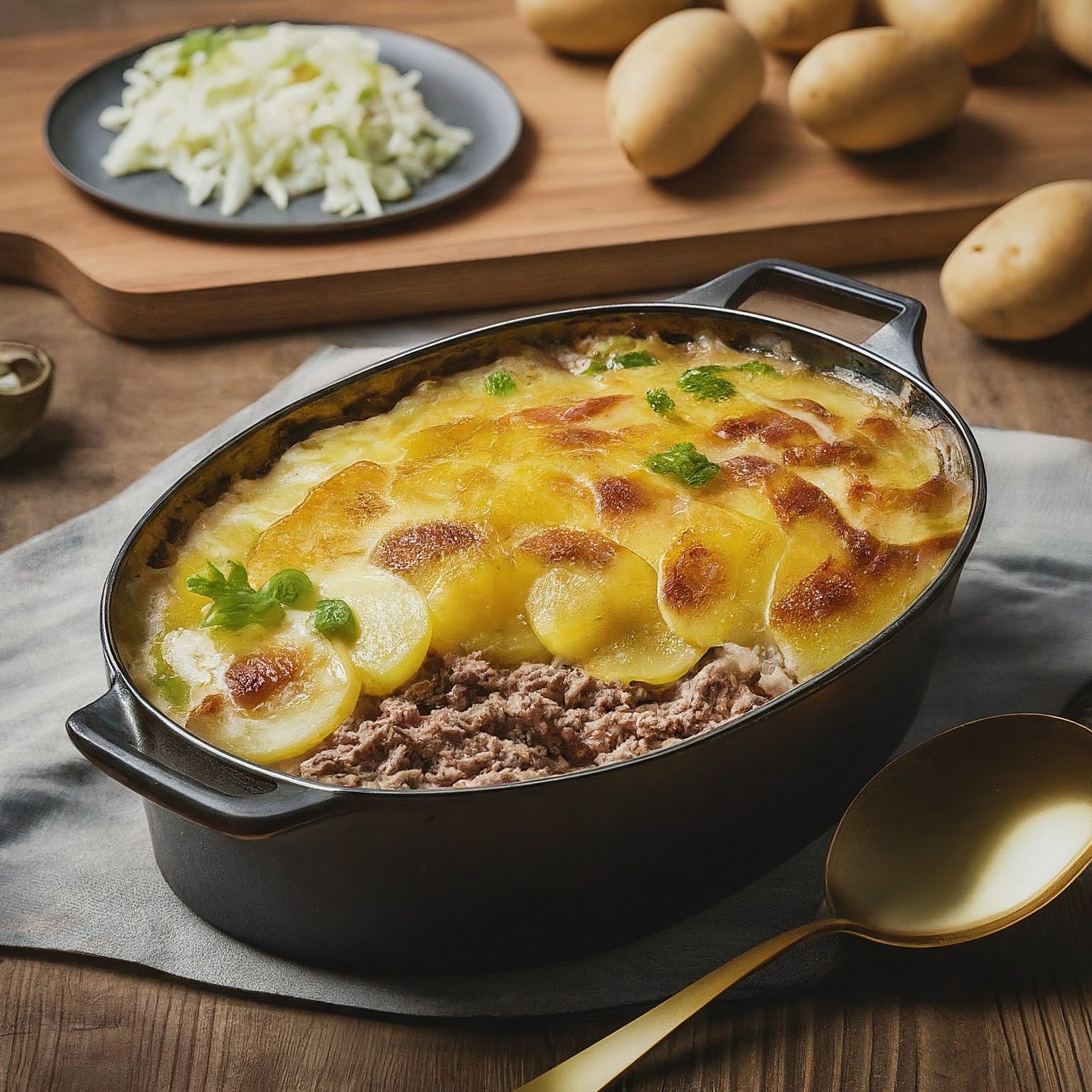 Ein klassischer Kartoffelgratin bekommt durch würziges Hackfleisch eine besondere Note. Dieser Auflauf ist einfach zubereitet und schmeckt der ganzen Familie.