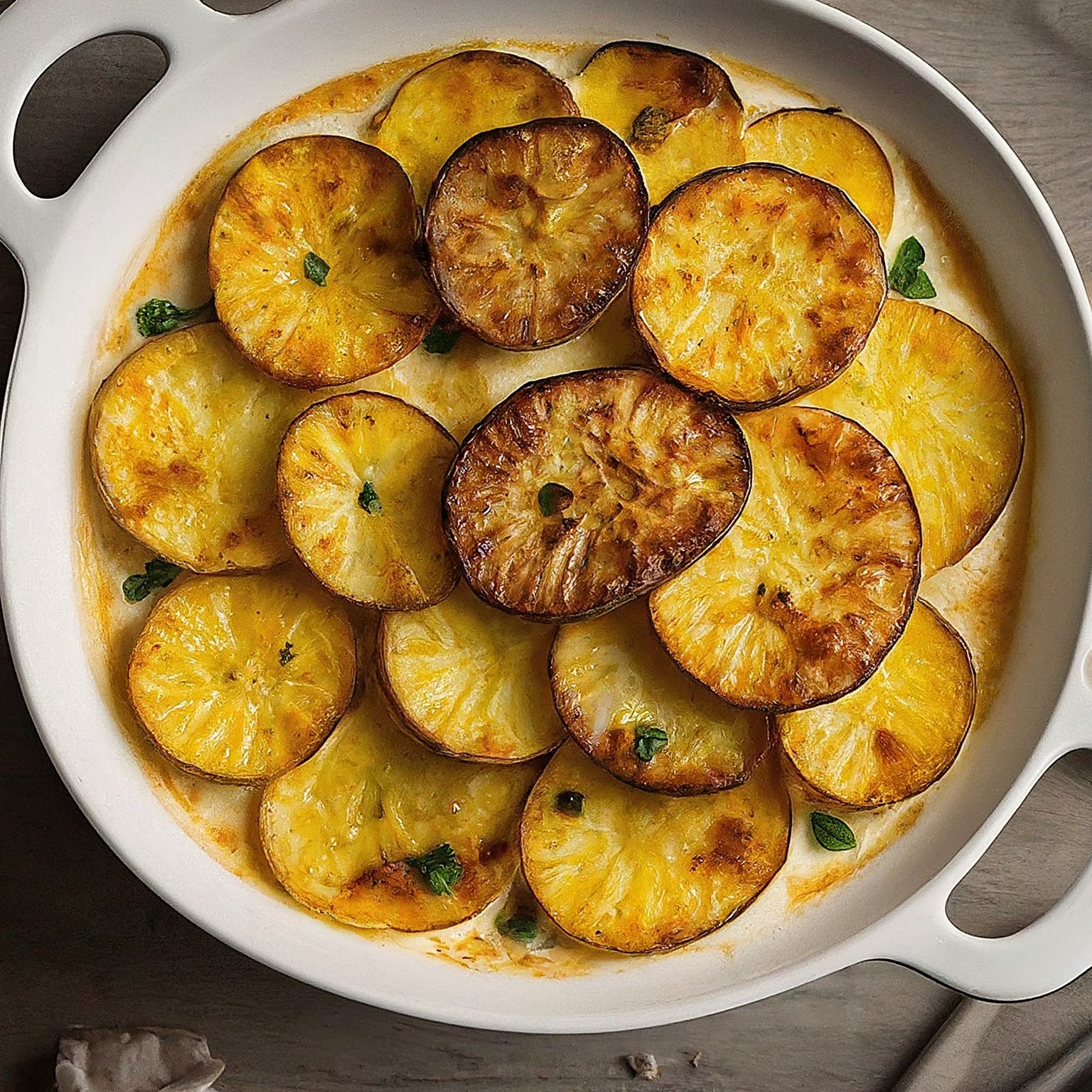 | 4. | Die Kartoffelscheiben schichtweise in die Auflaufform legen und dabei immer wieder mit der Sahnemischung übergießen. |