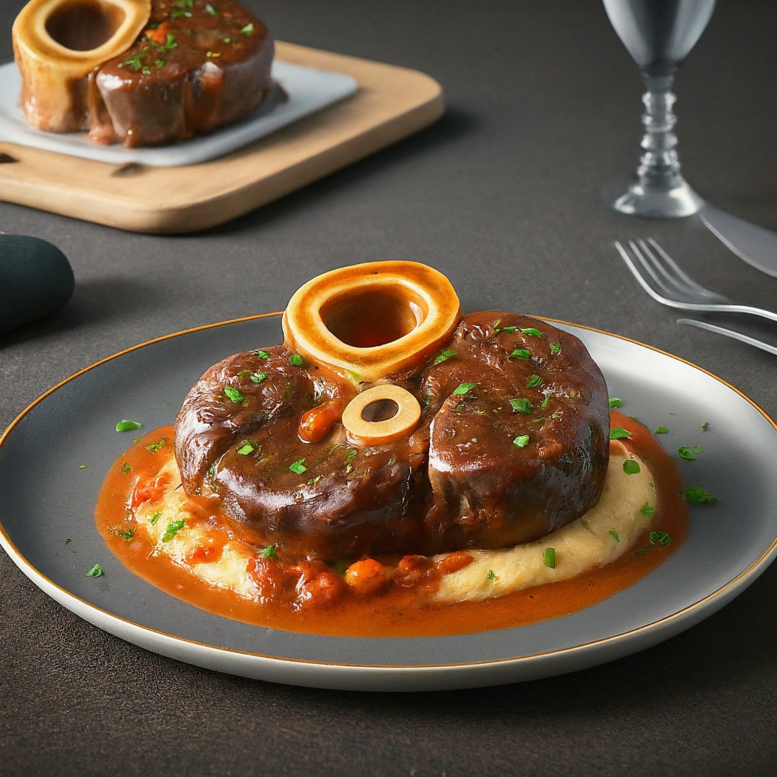 Ossobuco Sous-Vide in Klarsichtfolie gegart, für ein besonders zartes und aromatisches Ergebnis. Ein Klassiker der italienischen Küche, einfach und elegant.