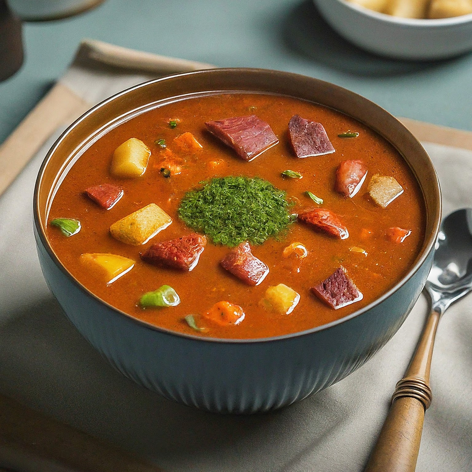 Ein deftiges Rezept für klassische Gulaschsuppe, perfekt für kalte Tage. Einfach zuzubereiten und mit zartem Rindfleisch, Kartoffeln und Paprika.