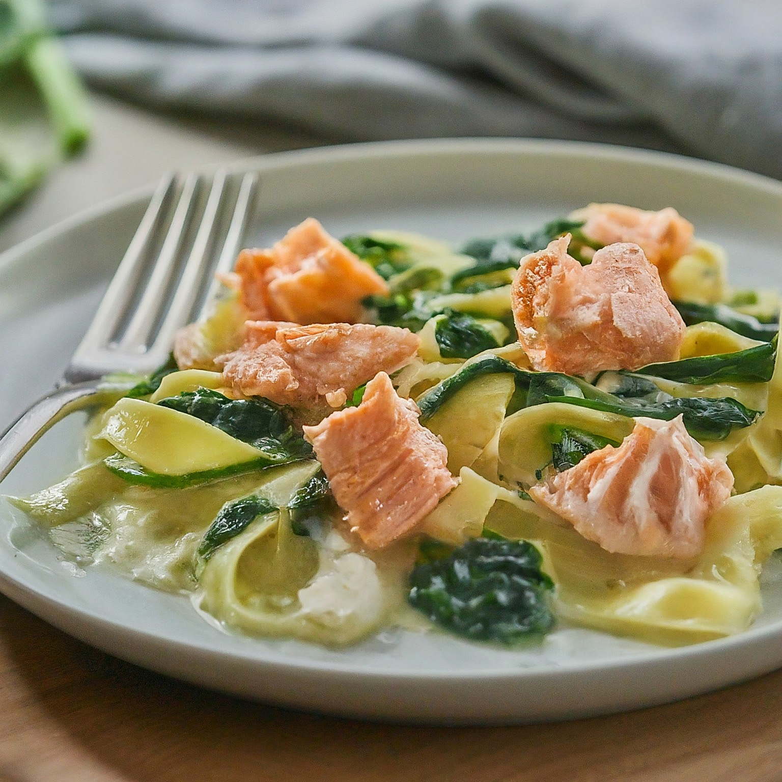 Ein schnelles und einfaches Rezept für Lachs mit Spinat und Bandnudeln. Gesund, lecker und perfekt für ein schnelles Abendessen.