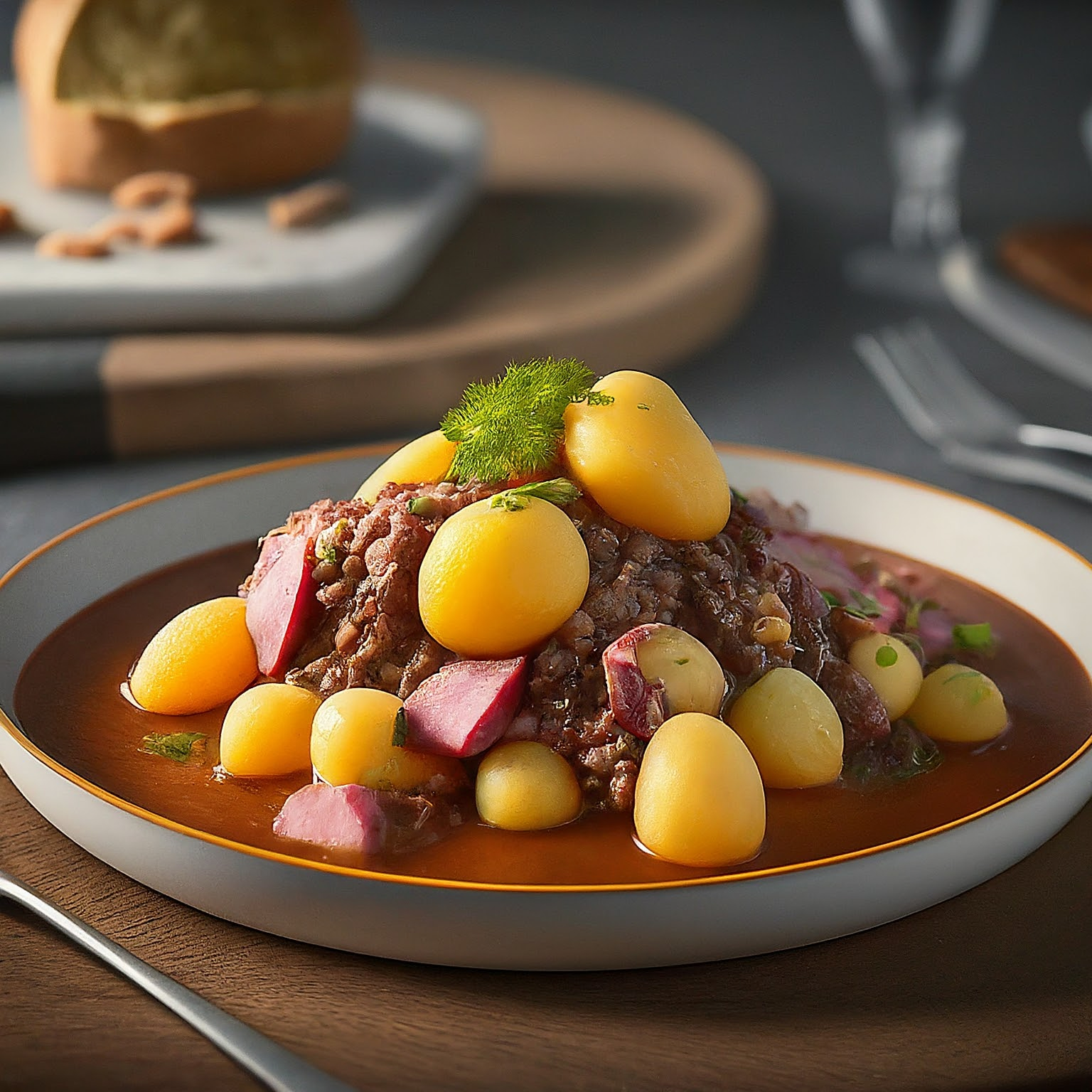 | 5. | Den Topf abdecken und bei schwacher Hitze ca. 90 Minuten köcheln lassen, bis das Fleisch und die Kartoffeln gar sind. |