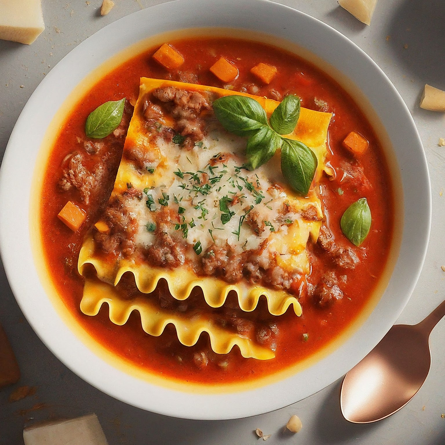 Eine schnelle und leckere Alternative zur klassischen Lasagne: Cremige Lasagnesuppe mit Hackfleisch, Nudeln und Käse. Perfekt für ein gemütliches Abendessen.