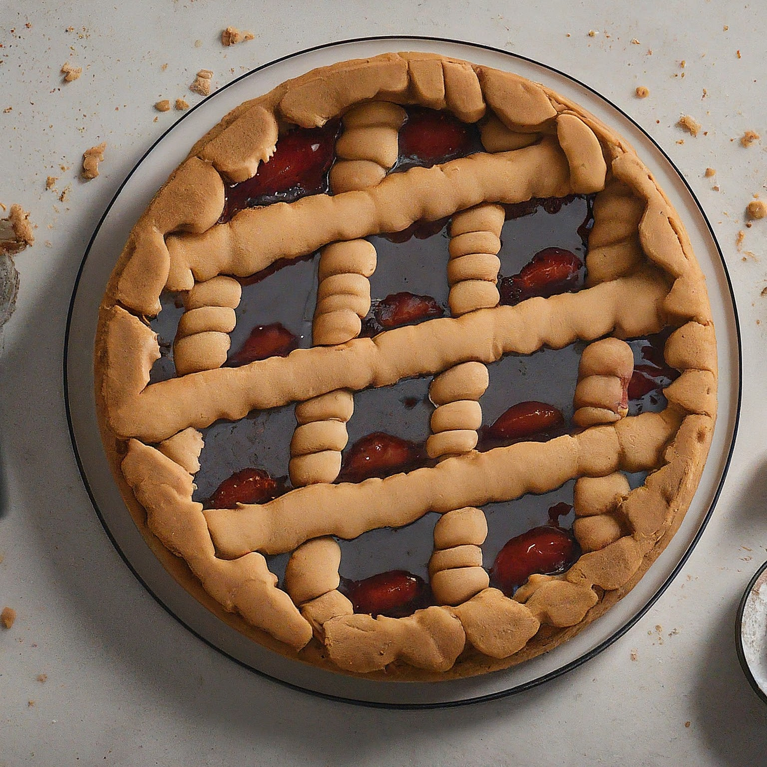 | 7. | Restlichen Teig ausrollen und in Streifen schneiden. Gitterförmig auf die Marmelade legen. |