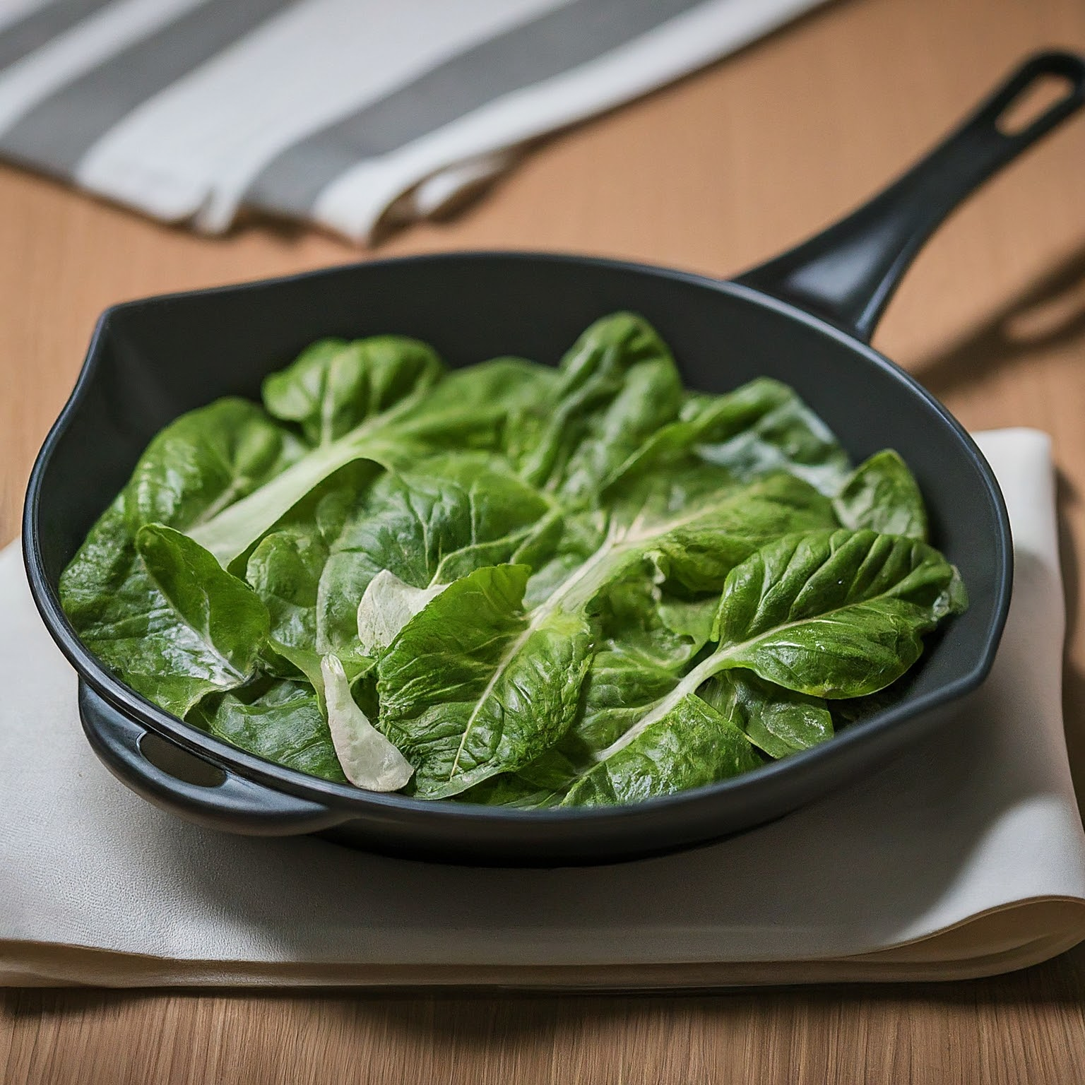 | 4. | Mangoldblätter in die Pfanne geben und unter gelegentlichem Rühren zusammenfallen lassen. |