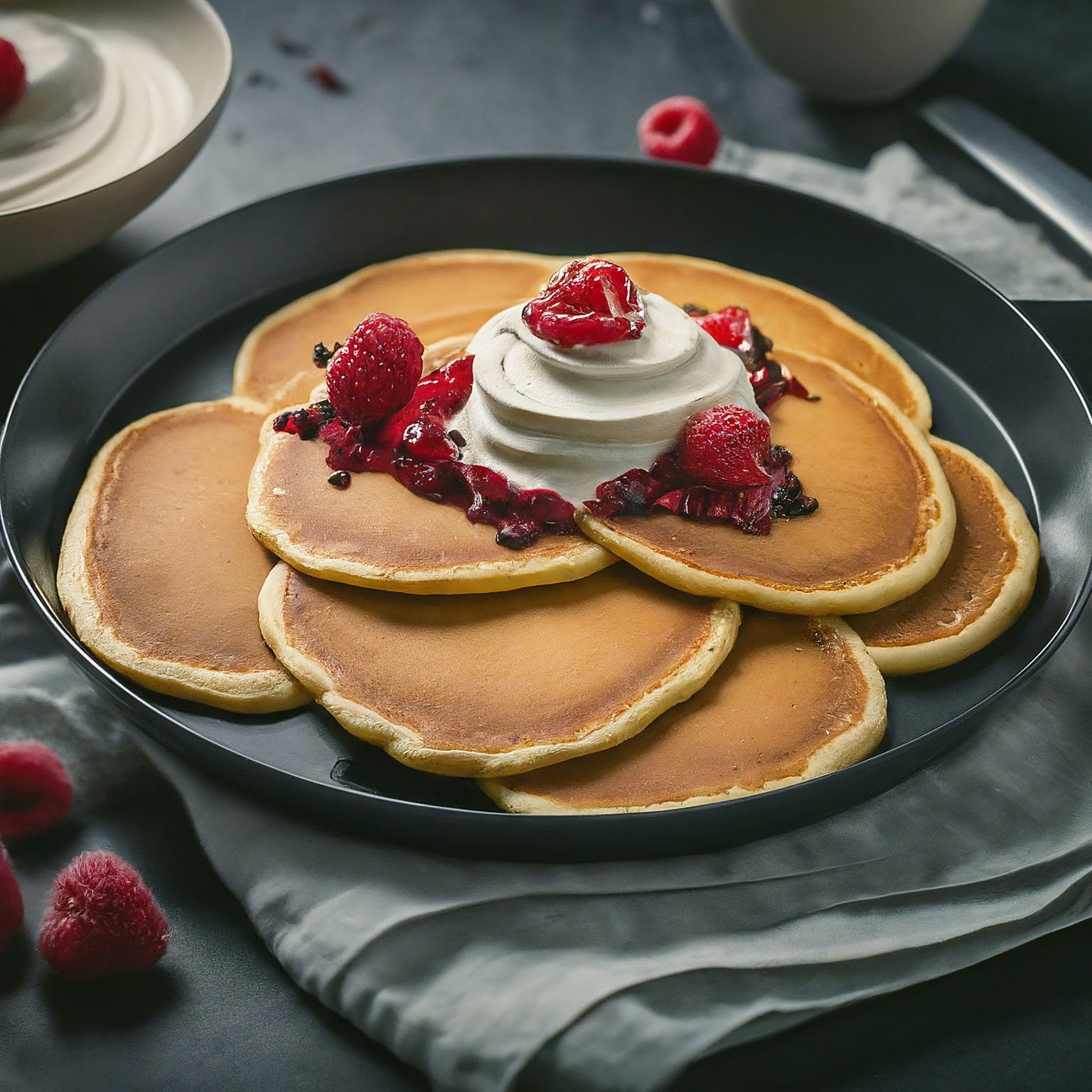4.Die fertigen Pfannkuchen nach Belieben mit Puderzucker, Marmelade, Nutella oder frischen Früchten servieren.