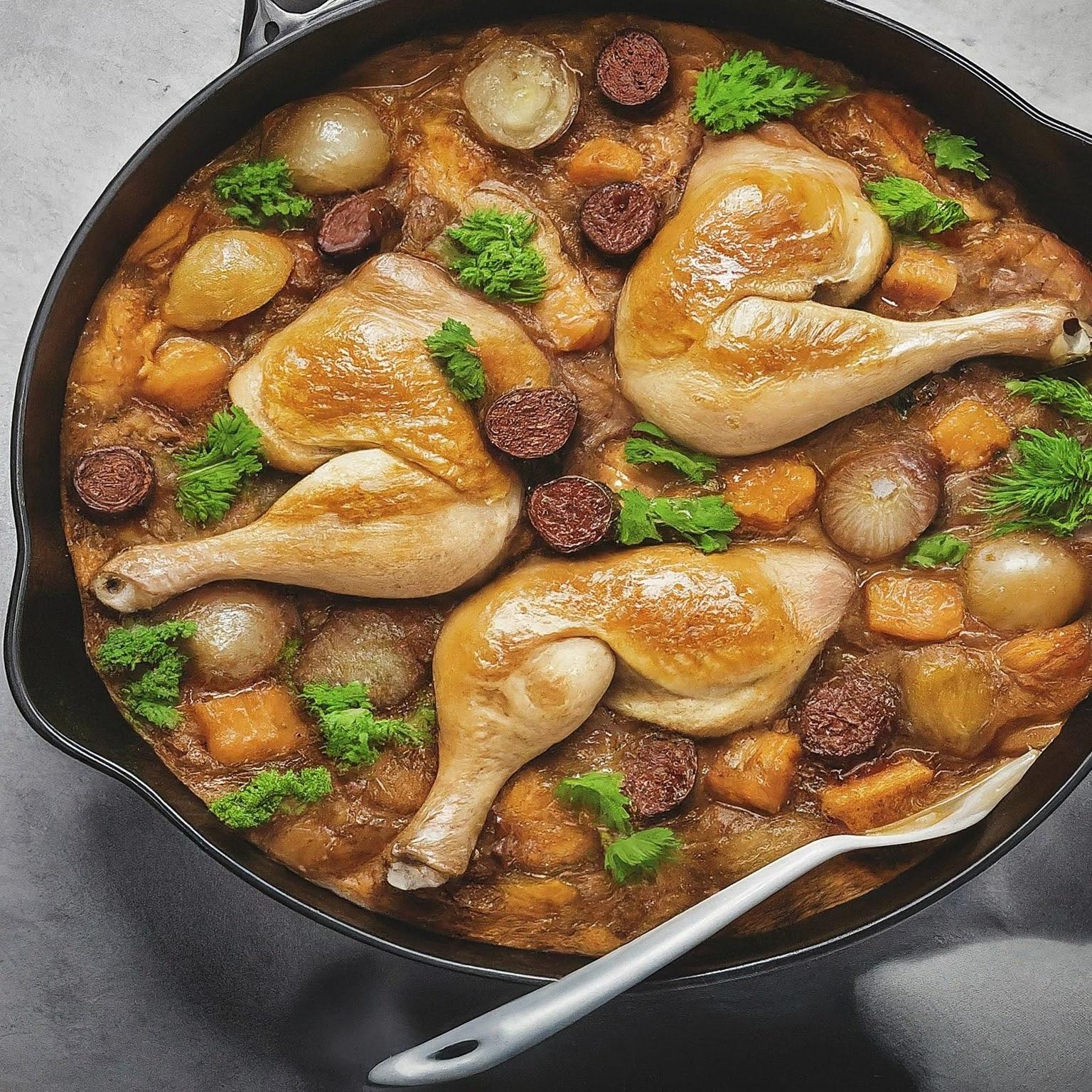 | 2. | Hähnchenbrustfilet in Olivenöl anbraten, bis es gar ist. Zwiebel und Knoblauch hinzufügen und kurz mitbraten. |