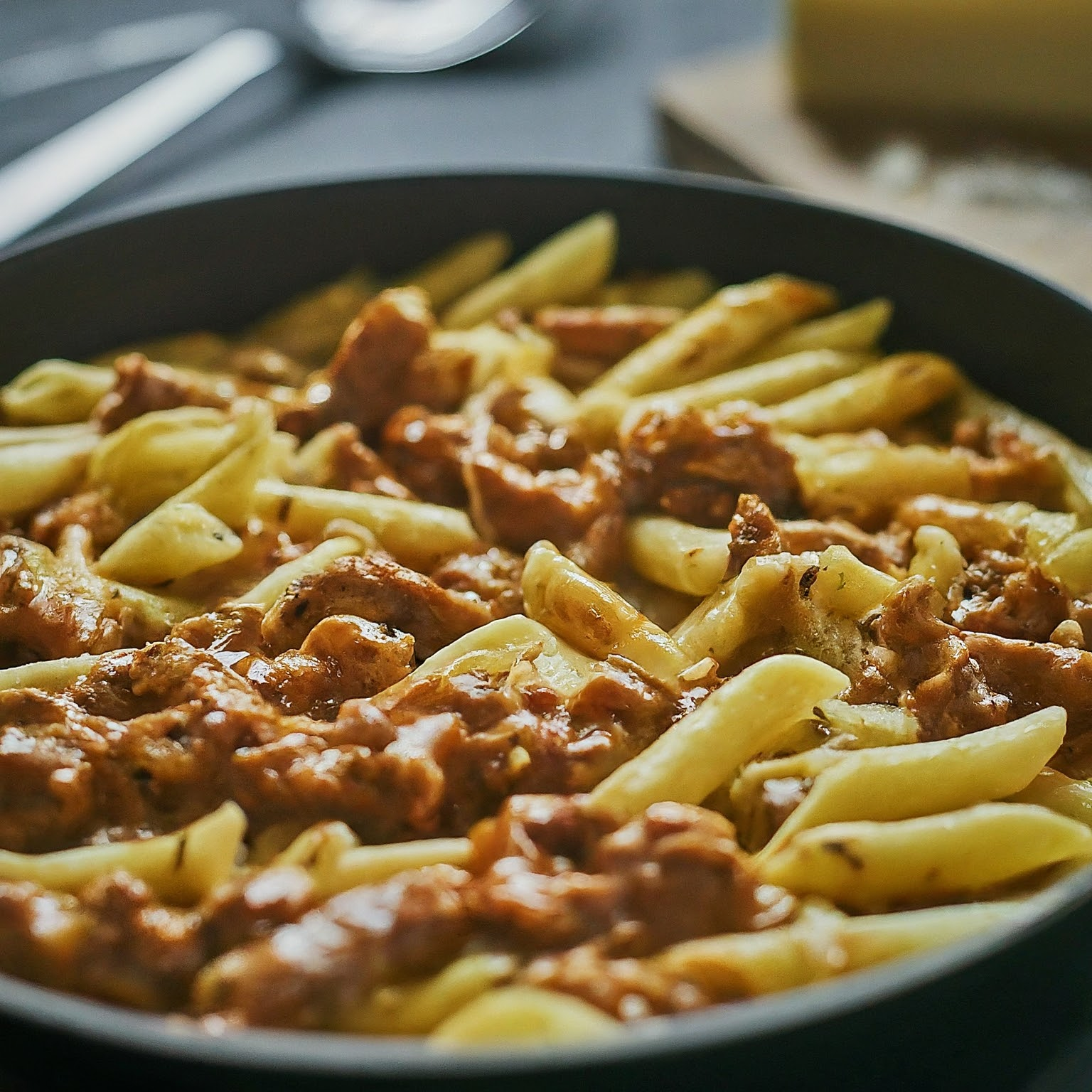7.Abgetropfte Nudeln mit der Soße vermengen.