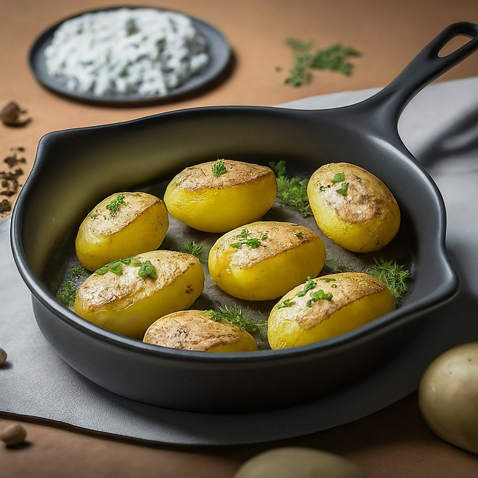 | 4. | Kartoffeln mit der Schnittfläche nach unten auf ein Backblech legen. |