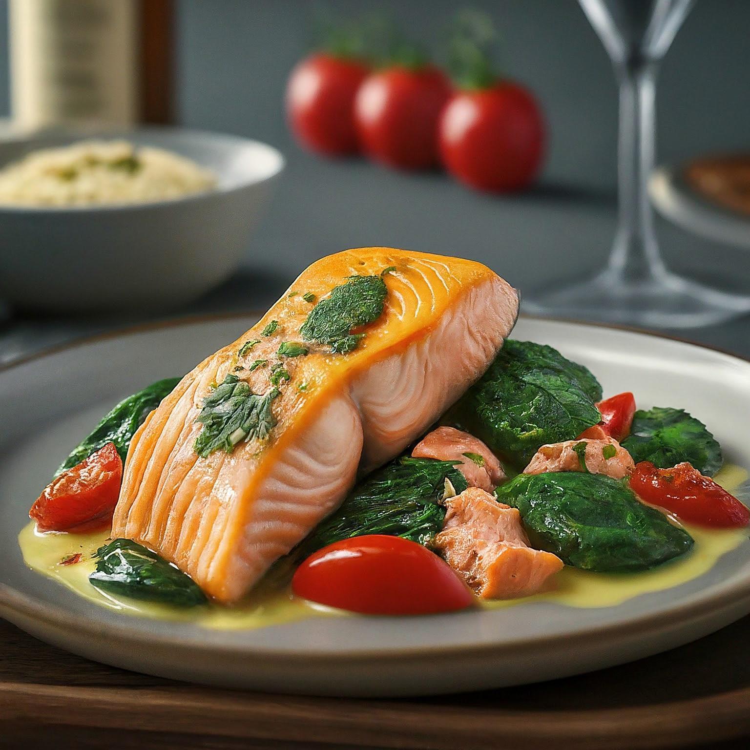 Ein einfacher und gesunder Lachs-Spinat-Auflauf mit saftigen Tomaten und einer cremigen Sauce. Perfekt für ein schnelles Abendessen!