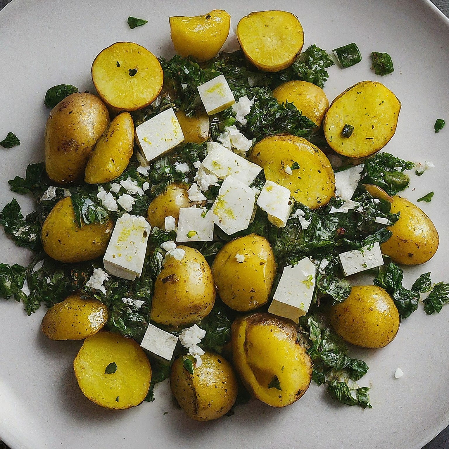 6.Den Feta über den Palmkohl und die Kartoffeln streuen und servieren.