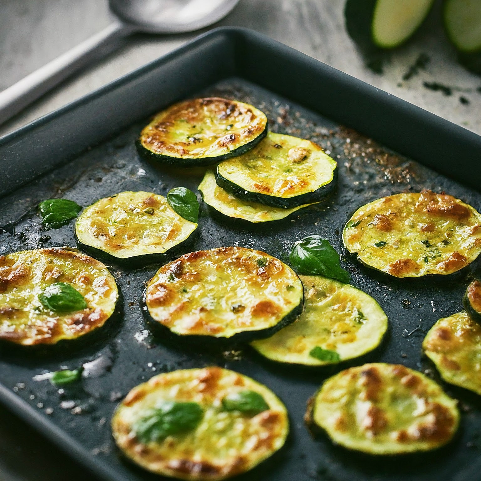 Knusprig panierte Zucchinischeiben aus dem Ofen – eine gesunde und leckere Alternative zu frittierten Zucchini.