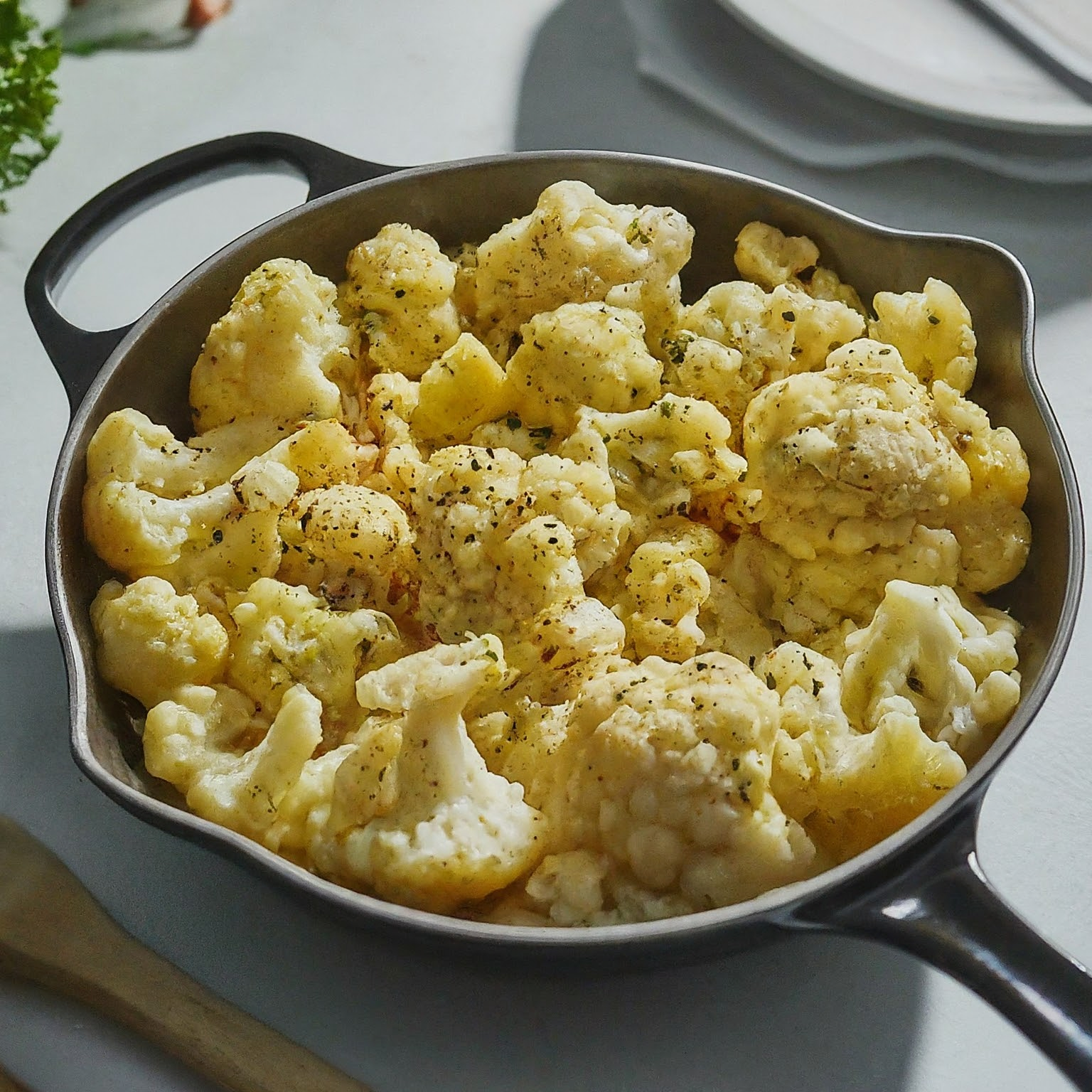 5.Im vorgeheizten Backofen bei 200°C (Ober-/Unterhitze) ca. 25 Minuten backen, bis der Blumenkohl goldbraun und knusprig ist.