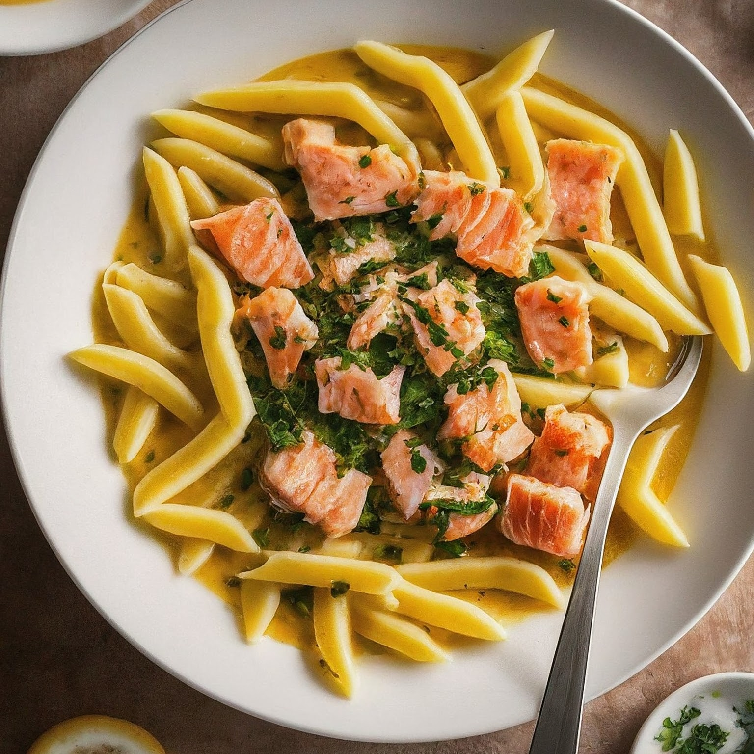 Cremige Lachs-Sahne-Soße umhüllt perfekt al dente gekochte Pasta. Dieses Gericht ist schnell zubereitet und ein echter Genuss für Fischliebhaber. Ein Hauch Zitrone rundet das Geschmackserlebnis ab.